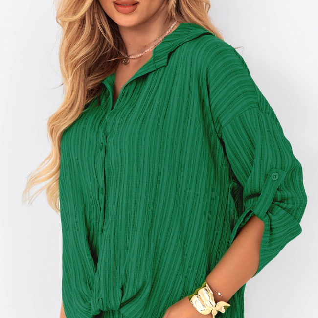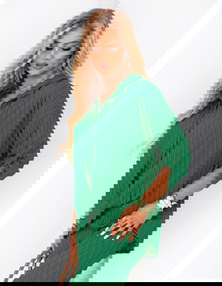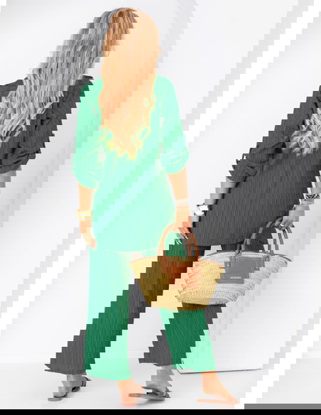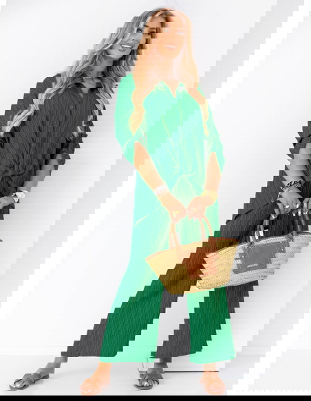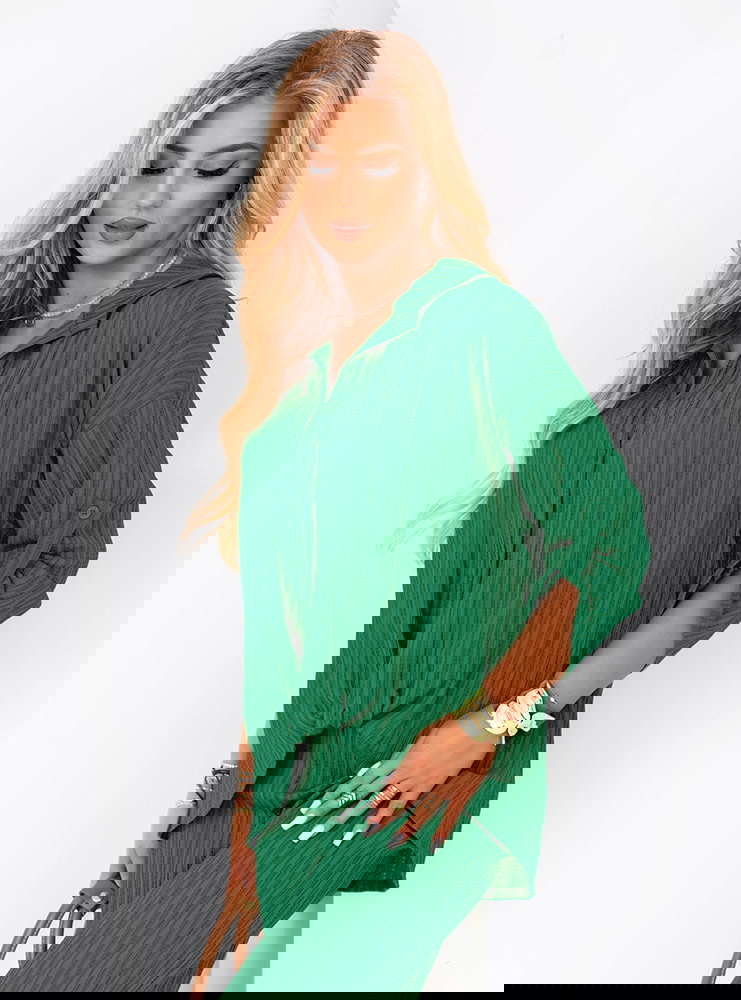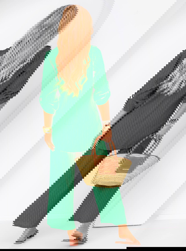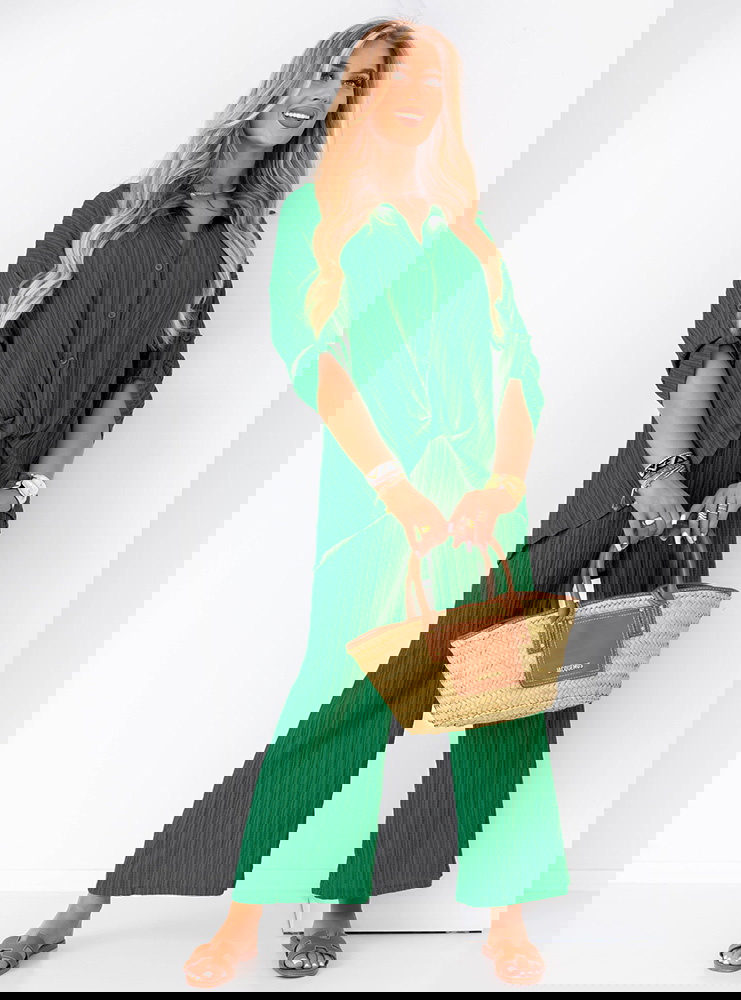 Komplet koszula zapinana na guziki i spodnie Preivaine - butelkowa zieleń to kwintesencja elegancji połączonej z codzienną wygodą. Koszula zapinana na guziki i spodnie o szerokich nogawkach tworzą spójną całość, która zachwyca lekkością fasonu. Delikatny, neutralny odcień pięknie podkreśla opaleniznę i świetnie komponuje się z wakacyjnymi dodatkami. Tunikowy krój koszuli z wiązaniem z przodu nadaje sylwetce zwiewności i pozwala subtelnie zaakcentować talię. Spodnie z elastyczną gumką w pasie gwarantują komfort noszenia przez cały dzień, a szerokie nogawki dodają pazura każdej stylizacji. Model ten to połączenie casualowego luzu i wyrafinowanego stylu, które sprawdzi się zarówno w miejskiej codzienności, jak i podczas letnich wyjazdów.