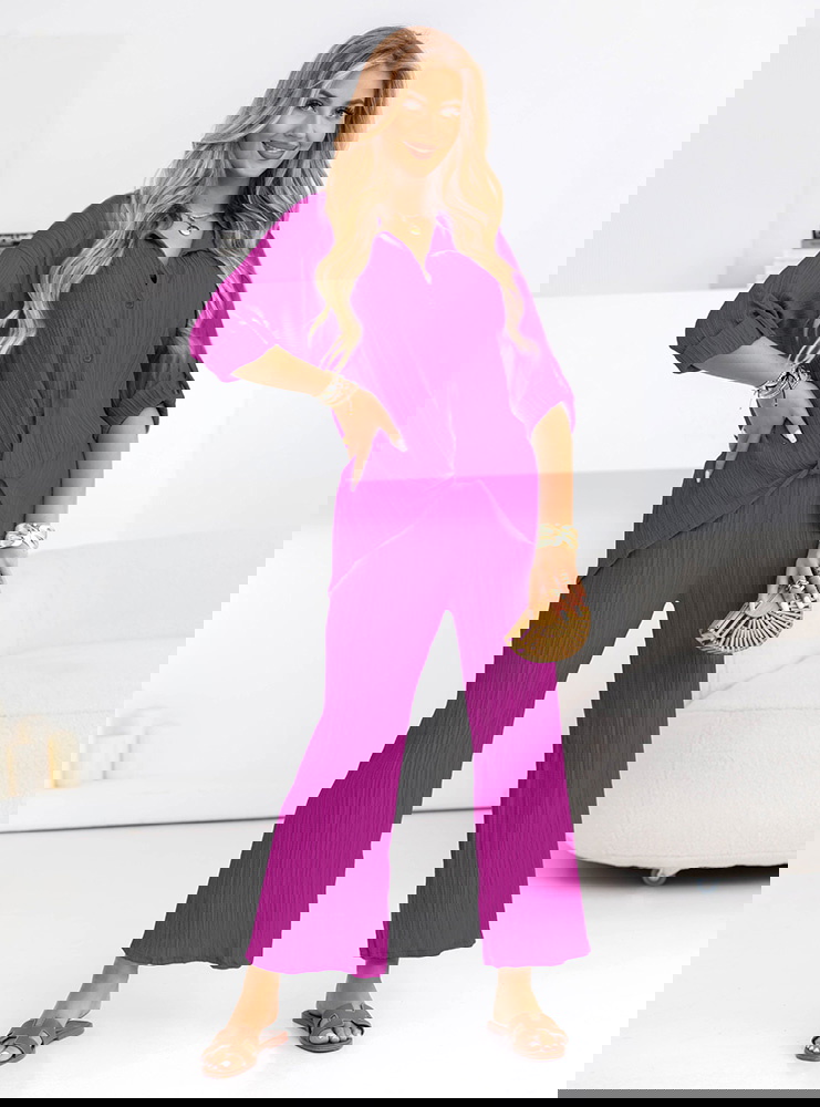 Komplet koszula zapinana na guziki i spodnie Preivaine - fuksja to kwintesencja elegancji połączonej z codzienną wygodą. Koszula zapinana na guziki i spodnie o szerokich nogawkach tworzą spójną całość, która zachwyca lekkością fasonu. Delikatny, neutralny odcień pięknie podkreśla opaleniznę i świetnie komponuje się z wakacyjnymi dodatkami. Sprawdzi się podczas letnich spacerów i spotkań z przyjaciółmi. To doskonały wybór na weekendowe wyjazdy, gdzie liczy się komfort i styl. Z powodzeniem zabierzesz go na wakacyjne kolacje na tarasie lub do kawiarni przy plaży. Świetnie wpisuje się w miejskie zestawy z lekkimi sandałami lub espadrylami. Dzięki uniwersalnemu fasonowi możesz łatwo przekształcić go w bardziej szykowny look, dobierając ulubione dodatki.