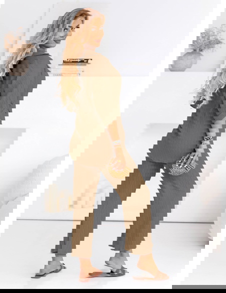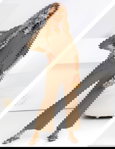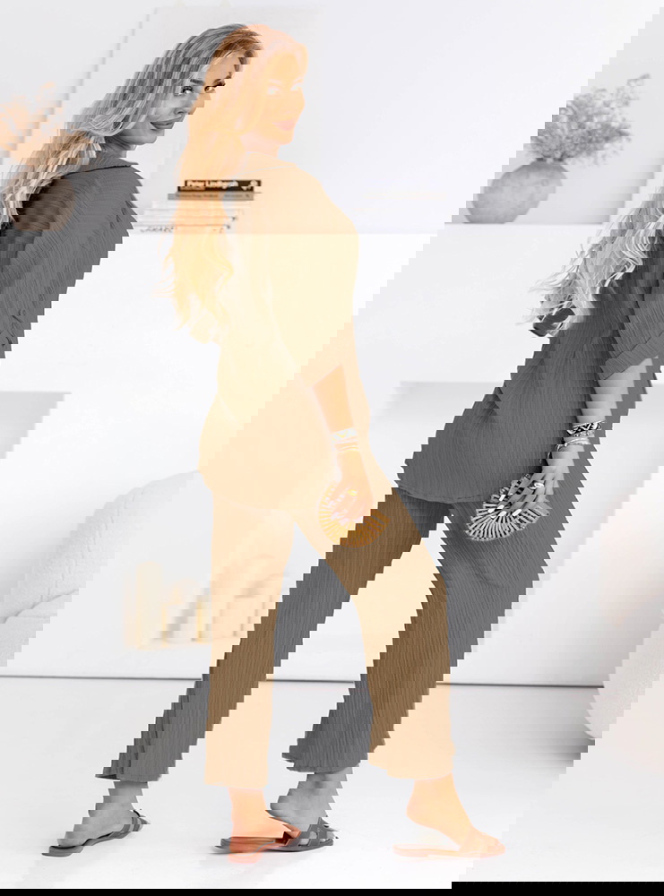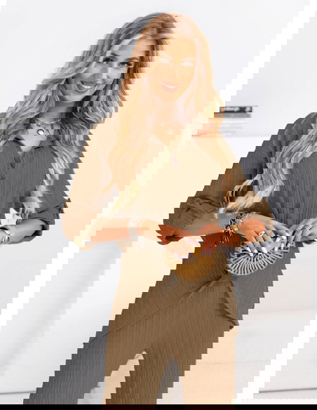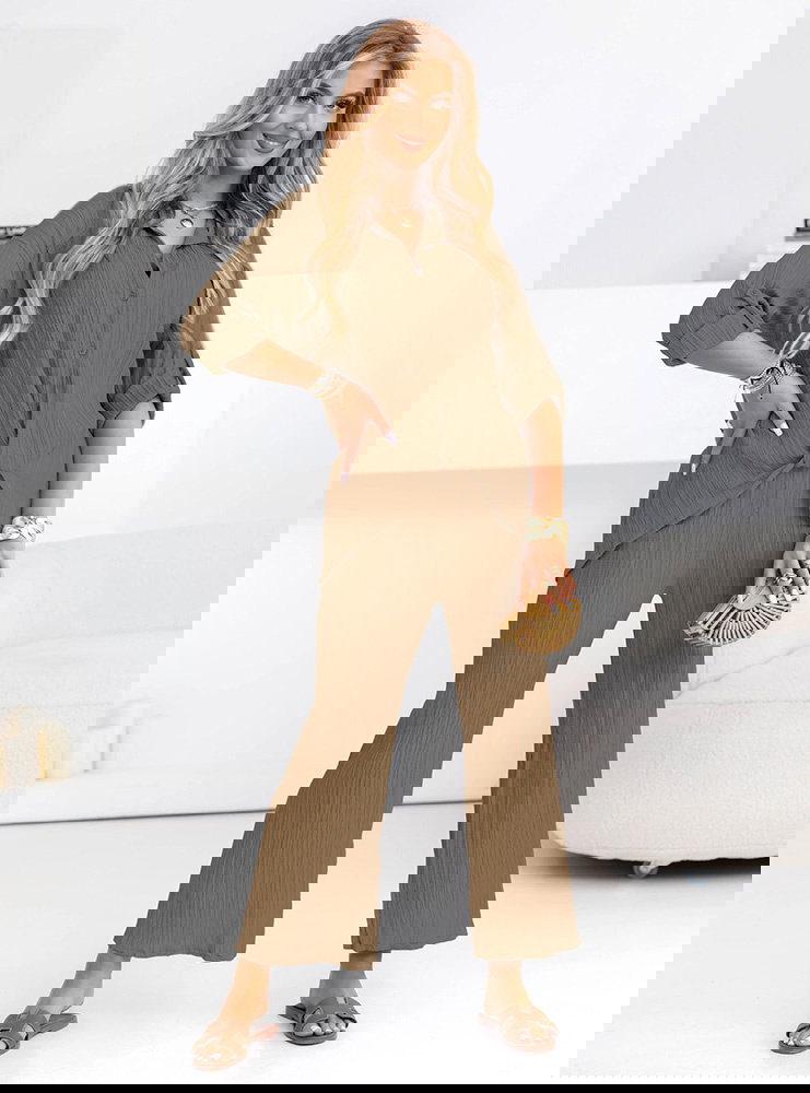 Komplet koszula zapinana na guziki i spodnie Preivaine - mocha mousse to kwintesencja elegancji połączonej z codzienną wygodą. Koszula zapinana na guziki i spodnie o szerokich nogawkach tworzą spójną całość, która zachwyca lekkością fasonu. Delikatny, neutralny odcień pięknie podkreśla opaleniznę i świetnie komponuje się z wakacyjnymi dodatkami. Tunikowy krój koszuli z wiązaniem z przodu nadaje sylwetce zwiewności i pozwala subtelnie zaakcentować talię. Spodnie z elastyczną gumką w pasie gwarantują komfort noszenia przez cały dzień, a szerokie nogawki dodają pazura każdej stylizacji. Model ten to połączenie casualowego luzu i wyrafinowanego stylu, które sprawdzi się zarówno w miejskiej codzienności, jak i podczas letnich wyjazdów.