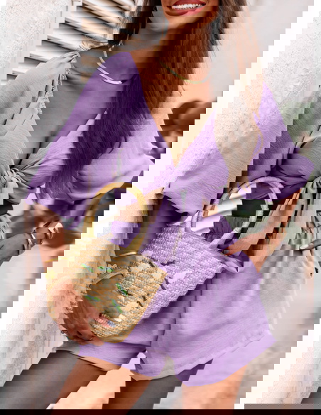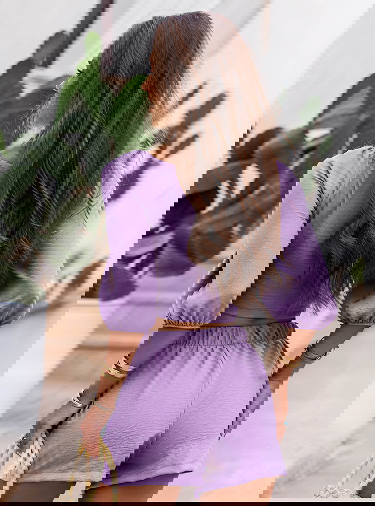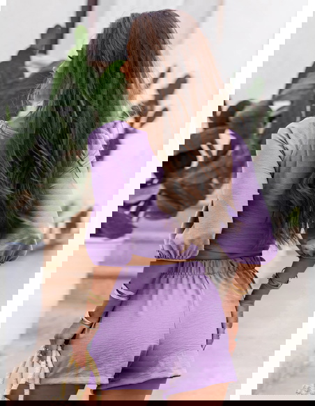 Liliowy komplet top z bufiastymi rękawami i spodenki Erlis