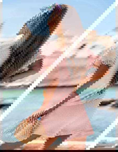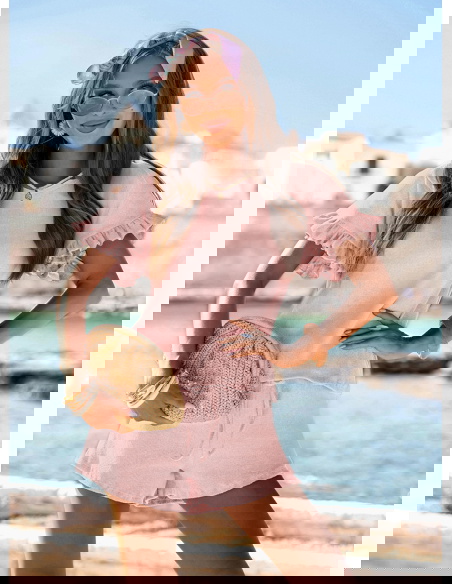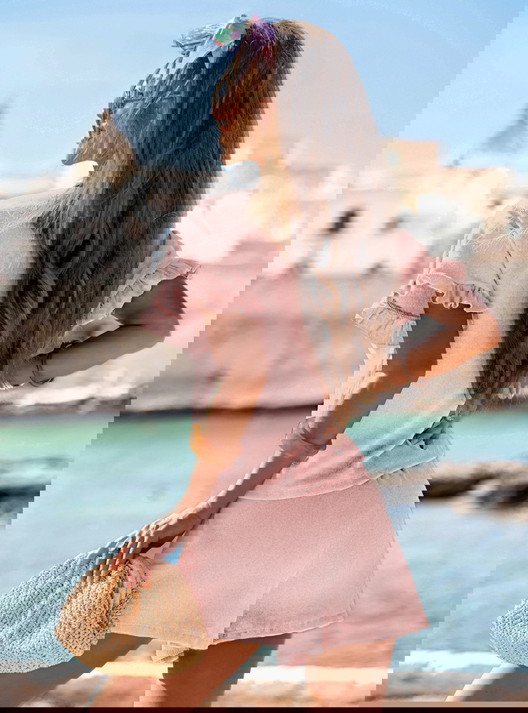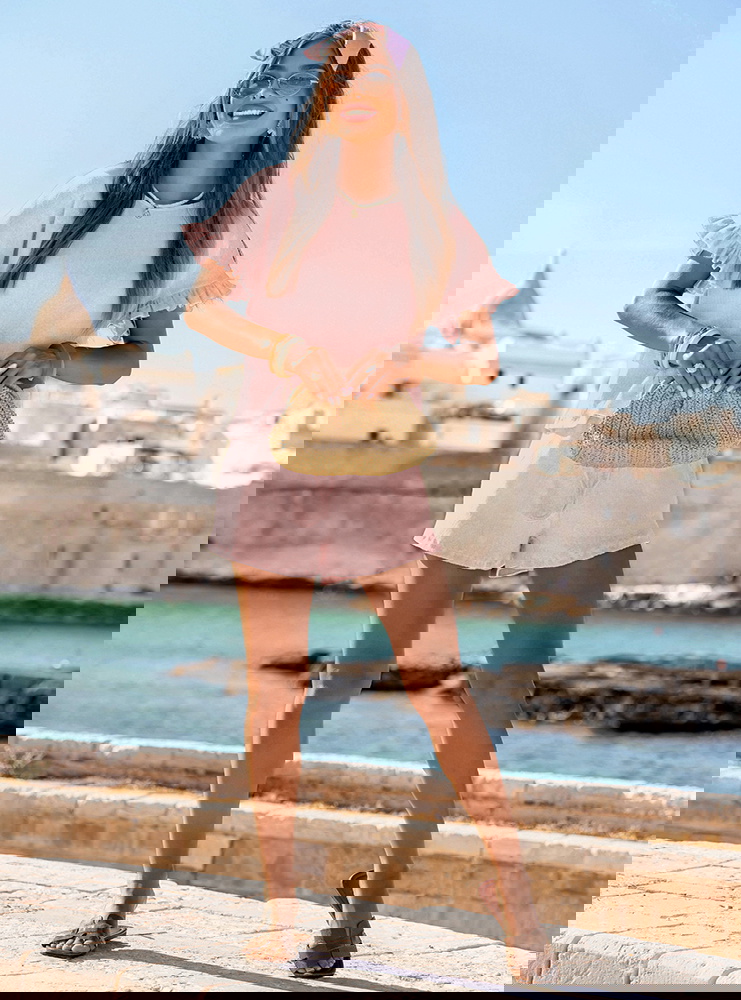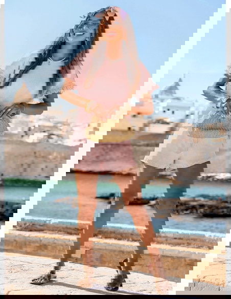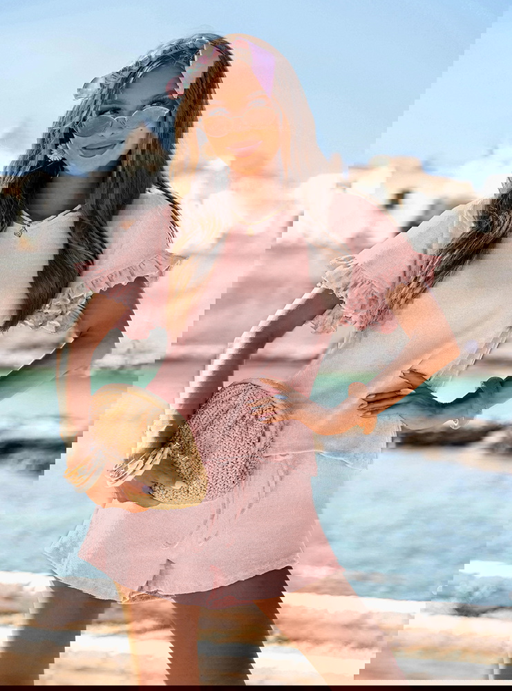 Pudrowy prążkowany komplet bluzka falbowana i szorty Tillia to połączenie wygody i kobiecego wdzięku w najbardziej wakacyjnym wydaniu. Luźna bluzka i lekkie szorty tworzą stylizację, która sprawdza się w każdej letniej sytuacji. Falbanki dodają całości romantycznego charakteru, a pastelowy kolor ożywia i rozświetla look. Doskonale wpisuje się w klimat kolekcji La Dolce Vita – pełnej światła, swobody i radości z chwili. Ten komplet pozwala czuć się swobodnie, ale i wyjątkowo. Właśnie tak powinna wyglądać moda na lato – lekka, niewymuszona, stylowa.