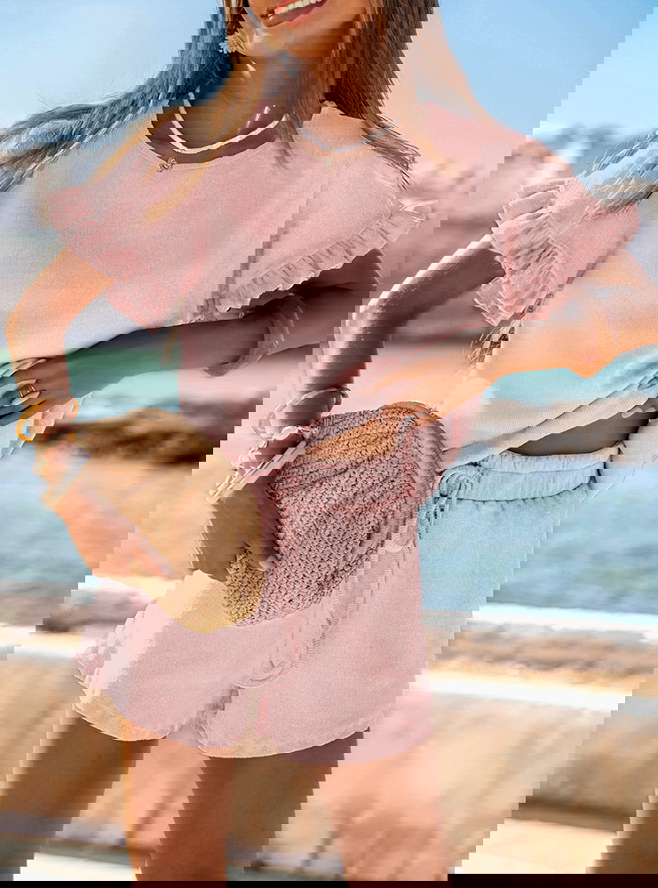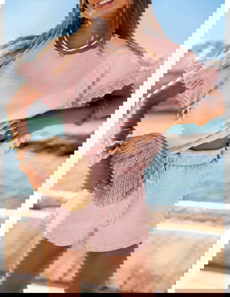 Pudrowy prążkowany komplet bluzka falbowana i szorty Tillia