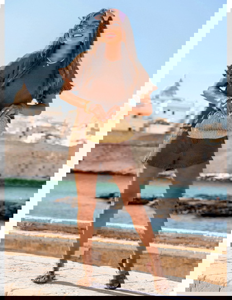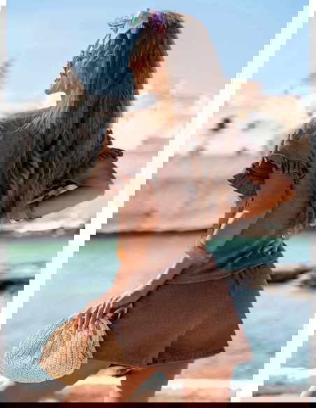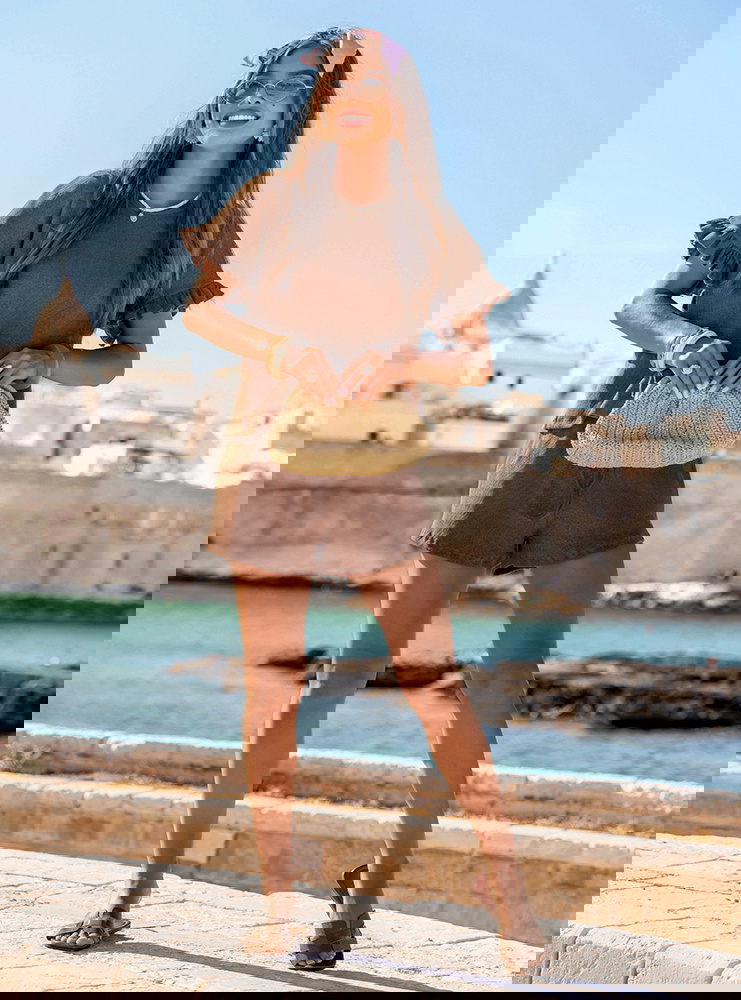 Prążkowany komplet bluzka falbowana i szorty Tillia - mocha mousse to subtelna propozycja dla kobiet, które cenią komfort i kobiecość w lekkim, letnim wydaniu. Delikatny krój z falbanami przy rękawach przyciąga uwagę i dodaje całości dziewczęcego uroku. Stylizację dopełniają szorty o luźnym kroju, które pięknie układają się na sylwetce. Ten zestaw to doskonałe połączenie wakacyjnej swobody z romantycznym wyczuciem stylu. Idealny na słoneczne dni, kiedy chcesz poczuć się pięknie bez zbędnego wysiłku. W kolekcji La Dolce Vita stawia się na radość z małych rzeczy – i właśnie taki jest komplet Tillia. Niewymuszony, lekki, a przy tym efektowny. Wystarczy dodać ulubione okulary i torebkę, by stworzyć gotowy look na lato.