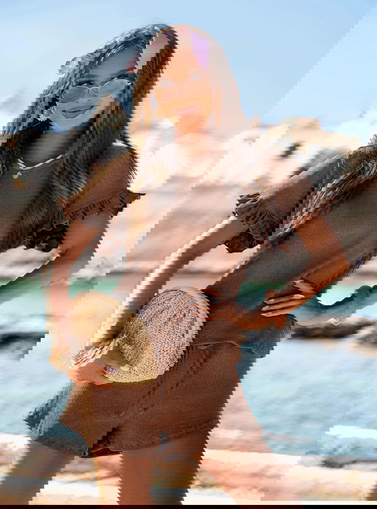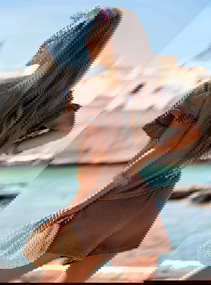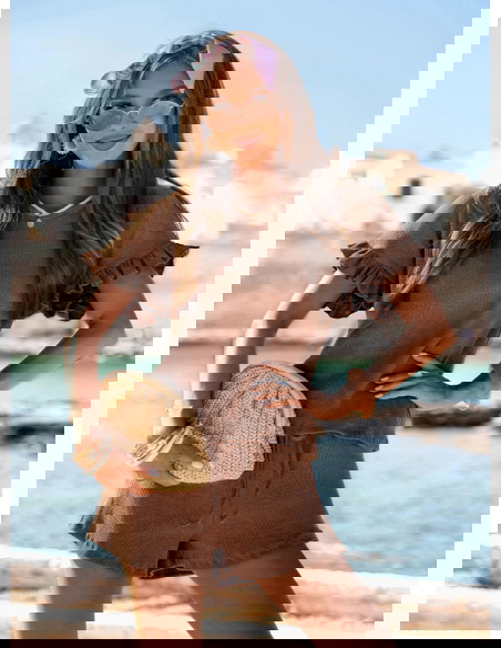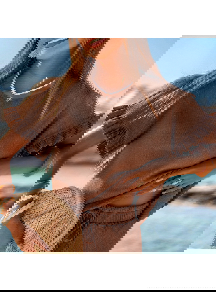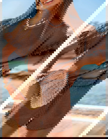 Prążkowany komplet bluzka falbowana i szorty Tillia - mocha mousse to połączenie wygody i kobiecego wdzięku w najbardziej wakacyjnym wydaniu. Luźna bluzka i lekkie szorty tworzą stylizację, która sprawdza się w każdej letniej sytuacji. Falbanki dodają całości romantycznego charakteru, a pastelowy kolor ożywia i rozświetla look. To propozycja, którą możesz zabrać na każdy wyjazd – nie zajmuje wiele miejsca, a daje mnóstwo możliwości.