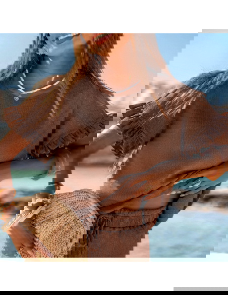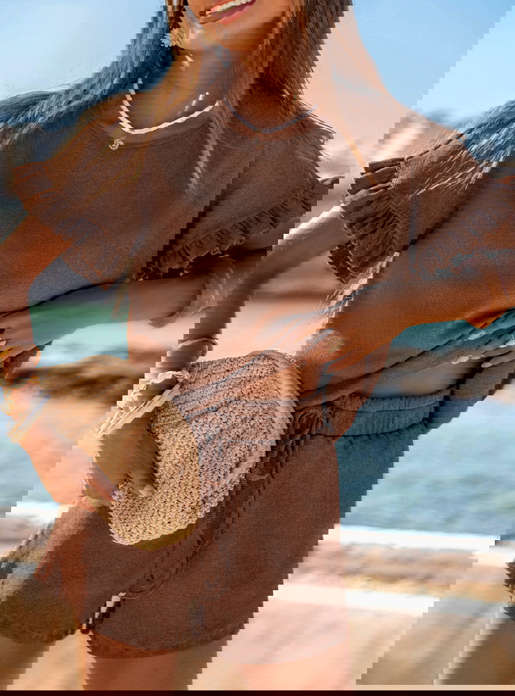 Prążkowany komplet bluzka falbowana i szorty Tillia - mocha mousse
