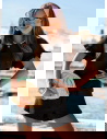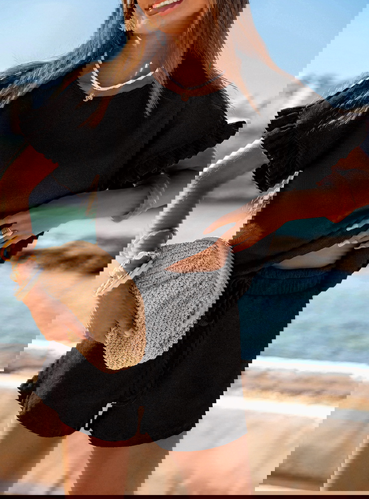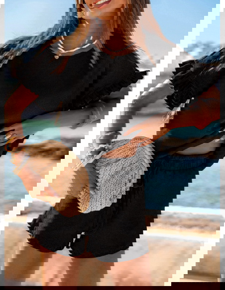 Czarny prążkowany komplet bluzka falbowana i szorty Tillia to subtelna propozycja dla kobiet, które cenią komfort i kobiecość w lekkim, letnim wydaniu. Delikatny krój z falbanami przy rękawach przyciąga uwagę i dodaje całości dziewczęcego uroku. Stylizację dopełniają szorty o luźnym kroju, które pięknie układają się na sylwetce. Ten zestaw to doskonałe połączenie wakacyjnej swobody z romantycznym wyczuciem stylu. To świetna opcja na spacer po mieście, piknik w parku czy weekendowy wyjazd. Sprawdzi się również na plaży jako lekka stylizacja narzucona na kostium. To zestaw, który nie wymaga dodatków, a mimo to przyciąga spojrzenia. Założysz go na co dzień, ale z odpowiednimi akcesoriami – również na letnie spotkanie ze znajomymi. Jest na tyle uniwersalny, że dopasujesz go do wielu różnych planów dnia.