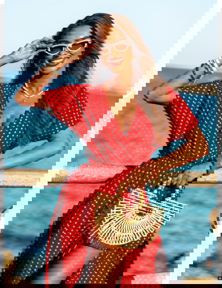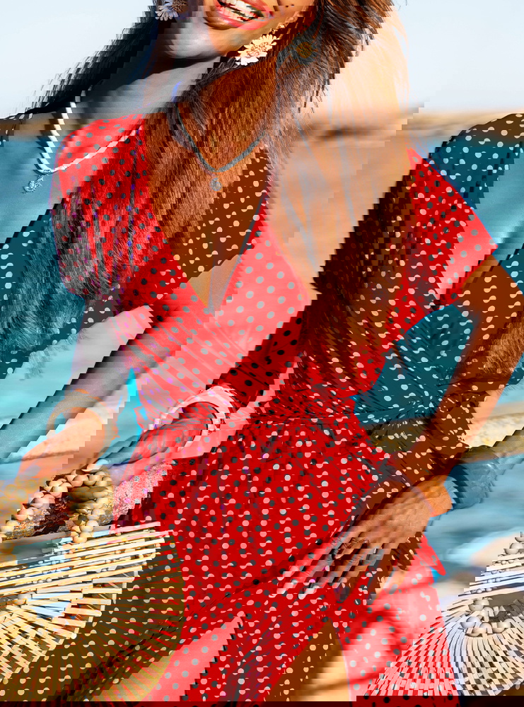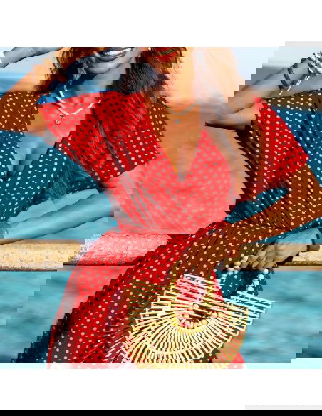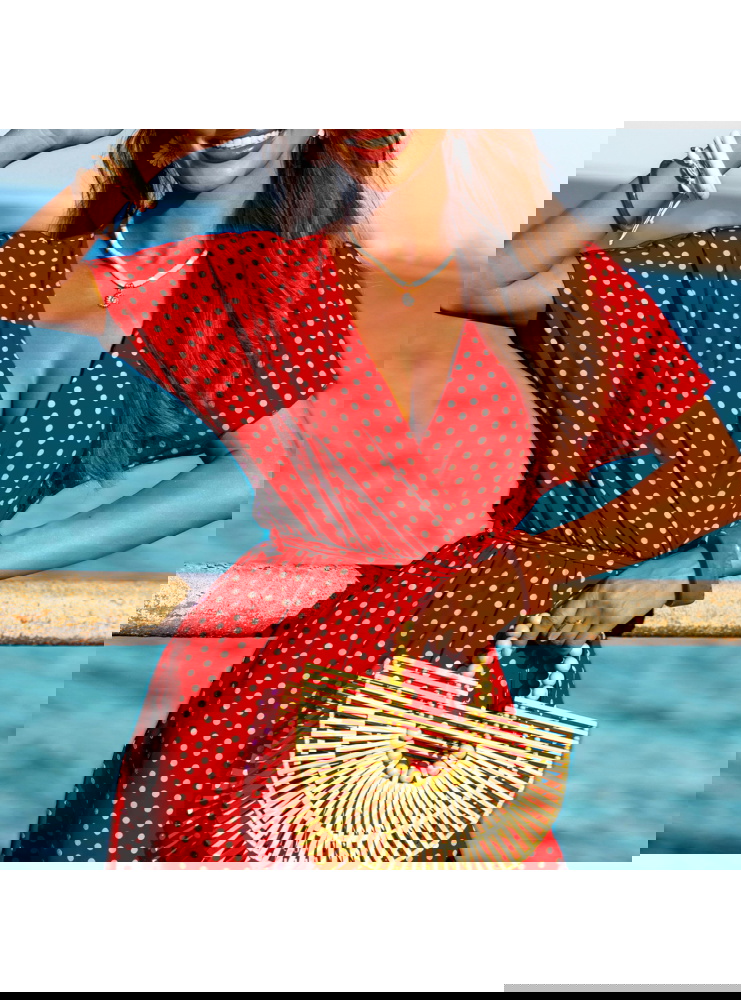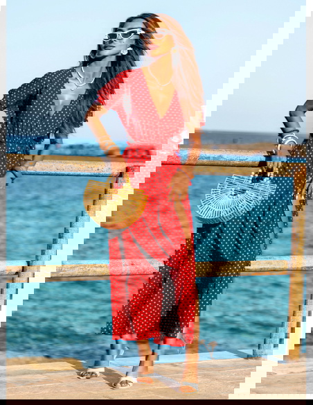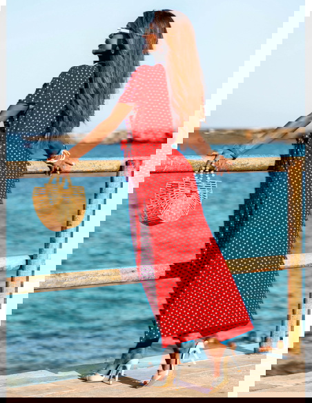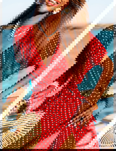 Wzorzysta sukienka z przekładanym dekoltem Taddea to połączenie klasycznego wzoru w groszki z nowoczesnym krojem, który podkreśla kobiecą sylwetkę i zapewnia wygodę. Jej wzór w białe groszki na czerwonym tle nadaje jej wyjątkowego charakteru, tworząc stylową i ponadczasową propozycję na lato. Sukienka wykonana z lekkiego materiału, idealnie sprawdzi się w upalne dni, oferując przewiewność i komfort. Przekładany dekolt podkreśla linię biustu, a krótki rękaw i rozcięcie na nodze dodają sukience zmysłowości i elegancji. Wiązanie w talii pozwala na dopasowanie sukienki do sylwetki, podkreślając atuty figury. Jest to propozycja, która doskonale sprawdzi się zarówno na co dzień, jak i na bardziej formalne wyjścia, np. letnie przyjęcia czy romantyczne kolacje.