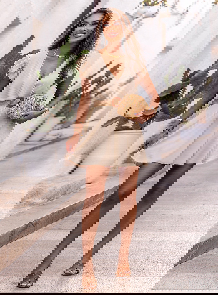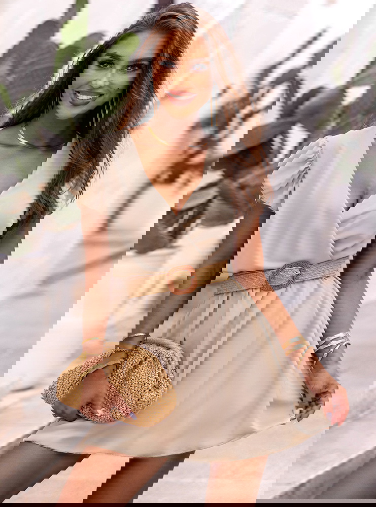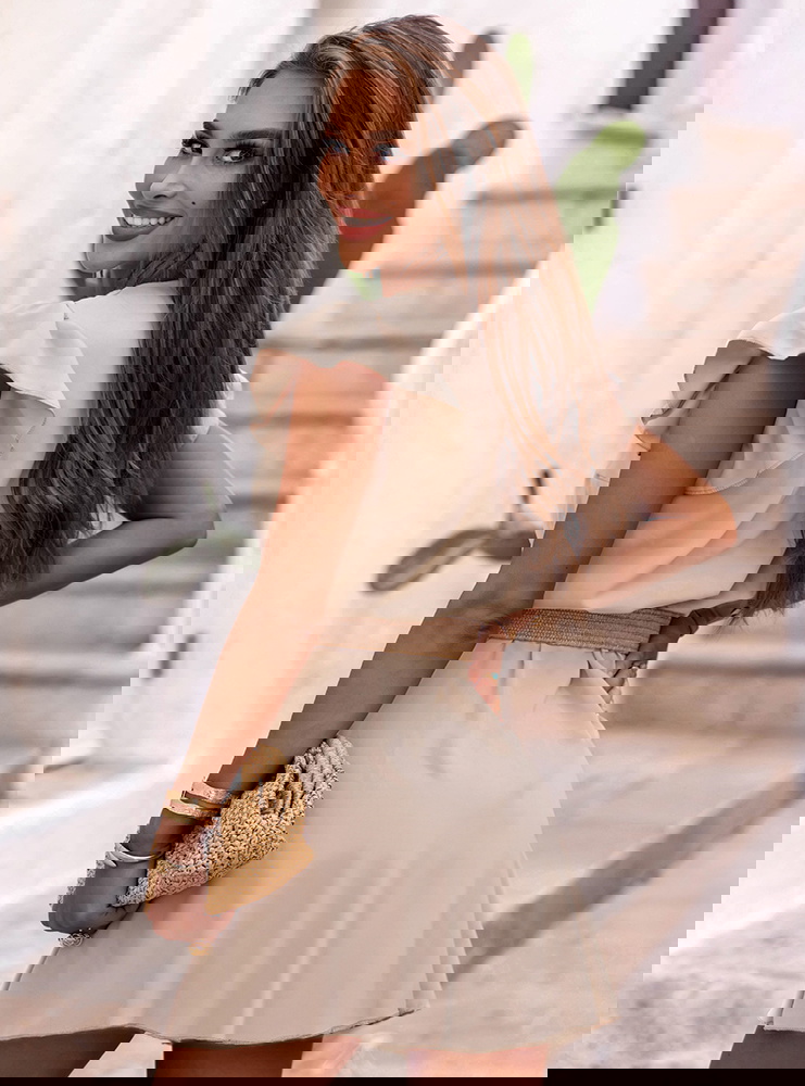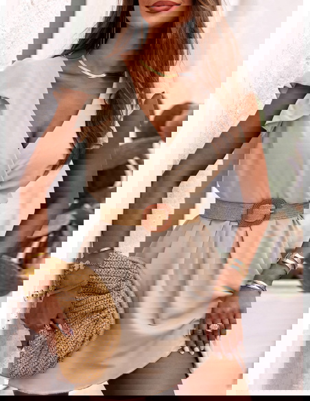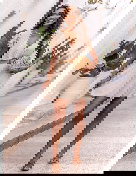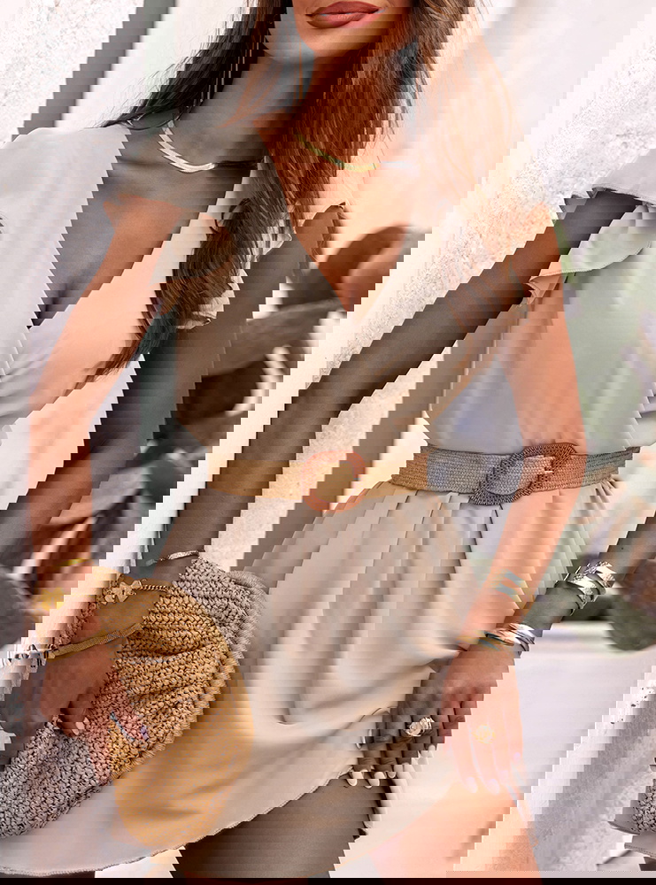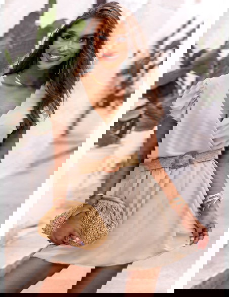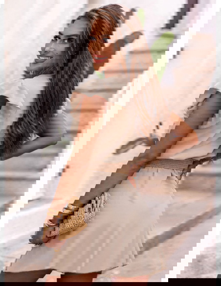 Beżowa sukienka z przekładanym dekoltem Soave to kwintesencja włoskiego minimalizmu i kobiecego uroku. Jej jasny, słoneczny kolor i lekki materiał tworzą stylizację, w której czujesz się swobodnie i pewnie. To sukienka, która pasuje do sandałków, espadryli i rattanowej torebki.