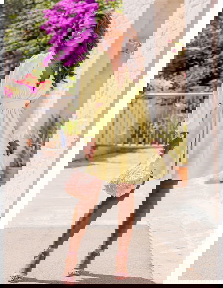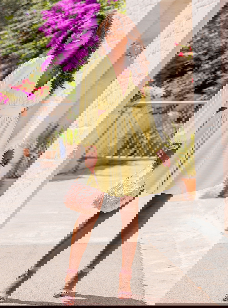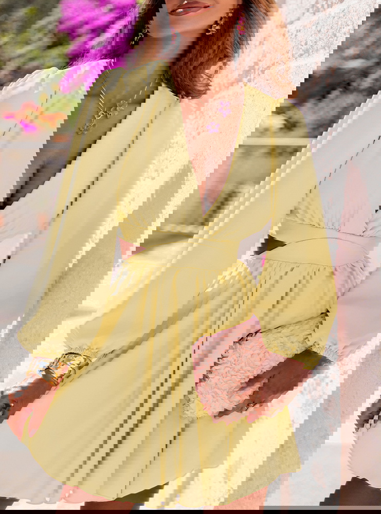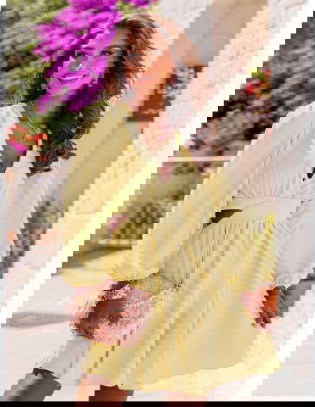 Sukienka rozkloszowana z wycięciem Gardenia - masełkowa to sukienka, która łączy w sobie romantyzm, kobiecość i letnią lekkość. Wyjątkowy krój podkreśla sylwetkę, a delikatny materiał otula ciało niczym ciepły podmuch wiatru. Dbałość o detale – jak wycięcia w talii, kopertowy dekolt czy lekko bufiaste rękawy – czyni ją nie tylko piękną, ale i niezwykle wygodną.