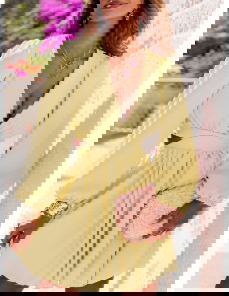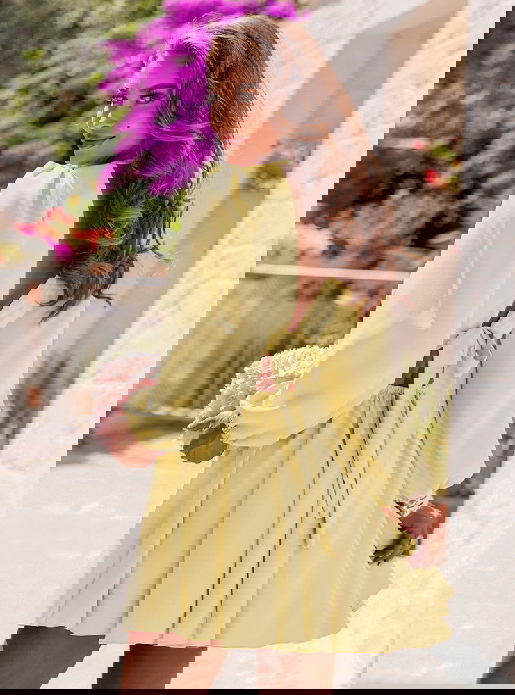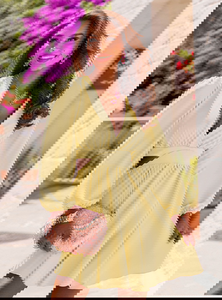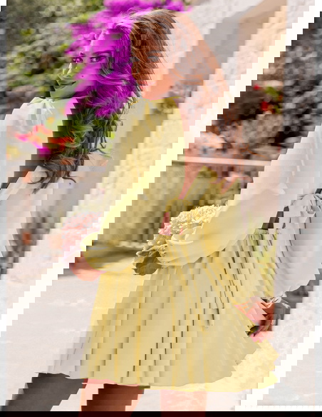 Sukienka rozkloszowana z wycięciem Gardenia - masełkowa to sukienka, która wygląda jak spełnienie marzeń o bajkowym lecie. Rozkloszowany dół nadaje sukience zwiewności i delikatnego ruchu – każdy krok wygląda jak taniec. Sukienka Gardenia to model o rozkloszowanym kroju z długimi rękawami zakończonymi delikatną gumką. Kopertowy dekolt pięknie podkreśla linię biustu, a subtelne wycięcia po bokach talii dodają sylwetce lekkości i seksapilu. Szeroki pas modeluje talię i nadaje sukience strukturę. Uszyta z lekkiej, zwiewnej tkaniny – idealnej na ciepłe dni. Z tyłu znajduje się dyskretny zamek, który zapewnia komfort zakładania.