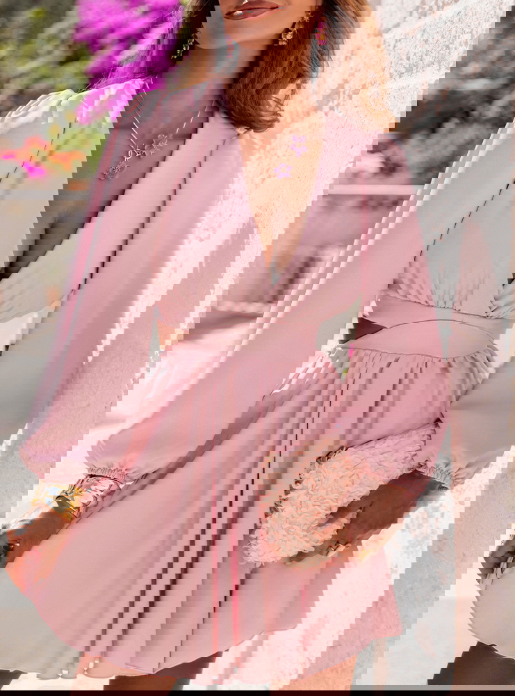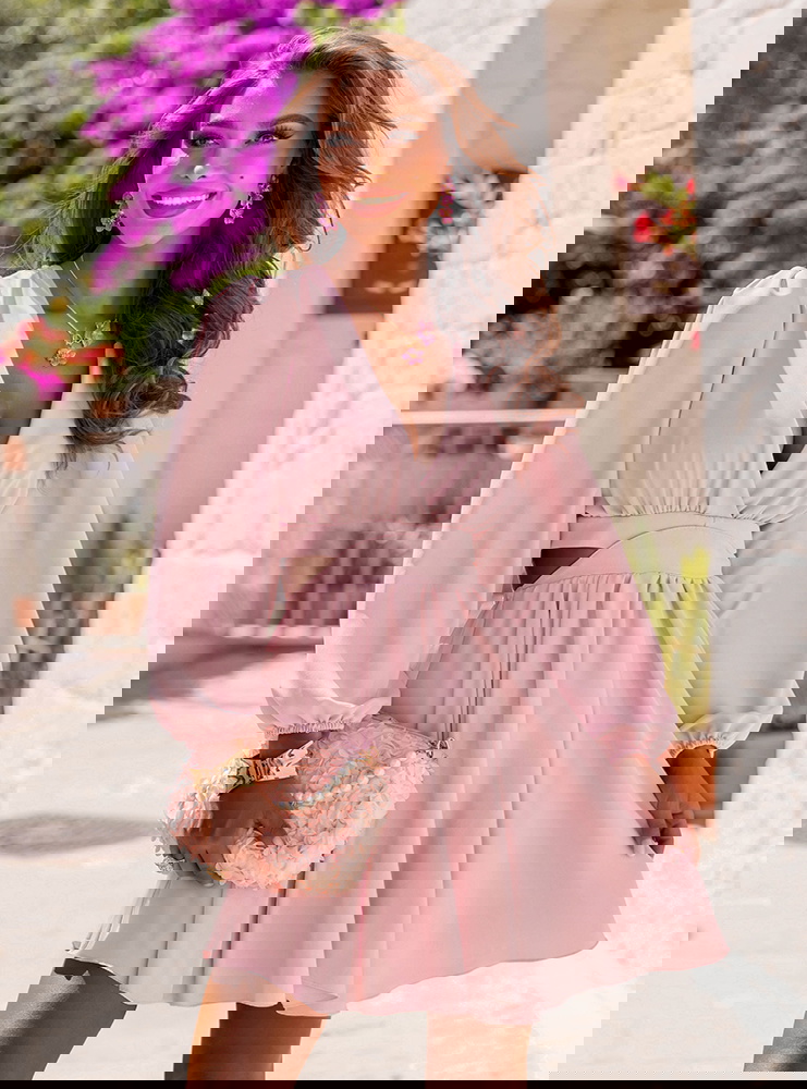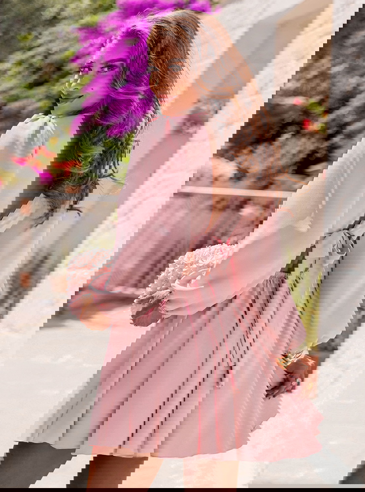 Pudrowa sukienka rozkloszowana z wycięciem Gardenia to sukienka, która wygląda jak spełnienie marzeń o bajkowym lecie. Rozkloszowany dół nadaje sukience zwiewności i delikatnego ruchu – każdy krok wygląda jak taniec. Gardenia to połączenie klasyki z nowoczesną formą, której nie da się przeoczyć. Idealna na wesele, garden party lub kolację wśród kwitnących bugenwilli. To kreacja, która sprawdzi się w słonecznych włoskich uliczkach, jak i podczas letnich przyjęć pod gołym niebem. Długi rękaw z bufką dodaje elegancji, a wycięcia w talii z subtelnym paskiem optycznie wysmuklają sylwetkę. Głęboki dekolt w kształcie litery „V” pięknie eksponuje szyję i obojczyki, tworząc kobiecą i zmysłową linię.