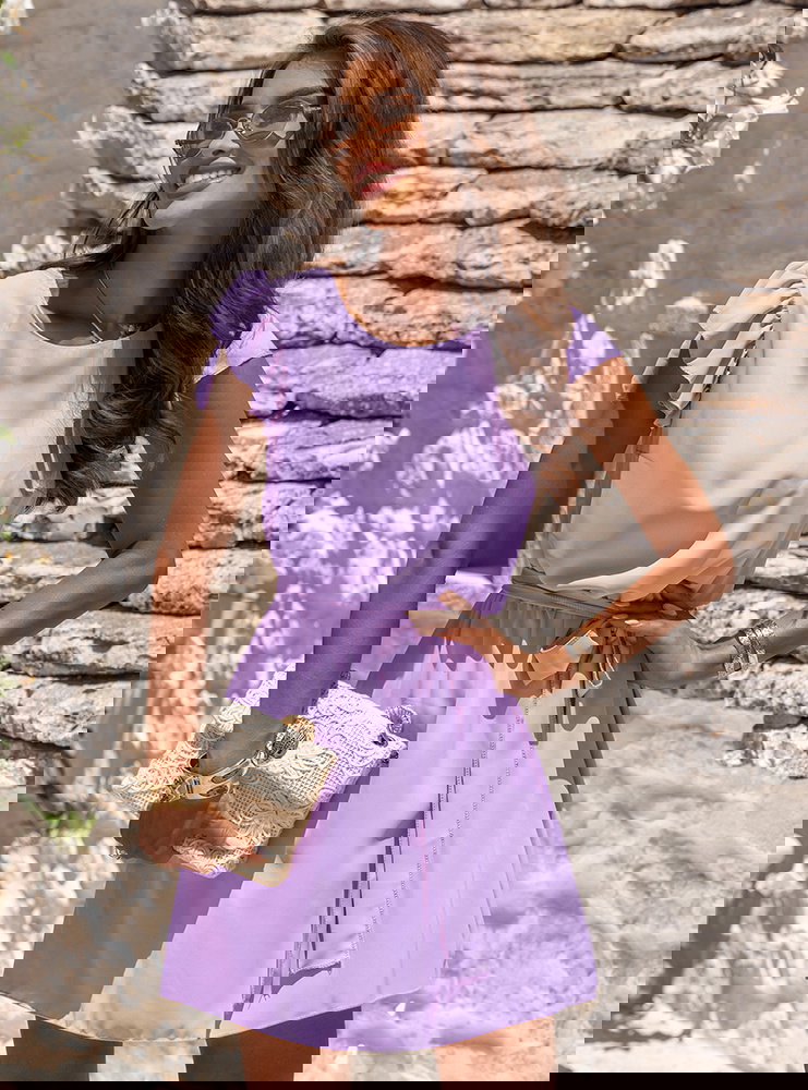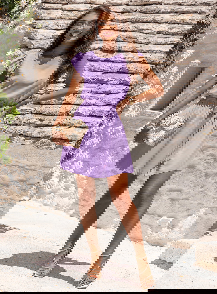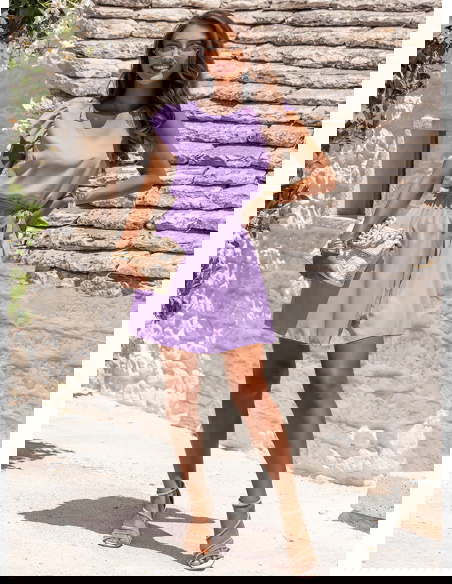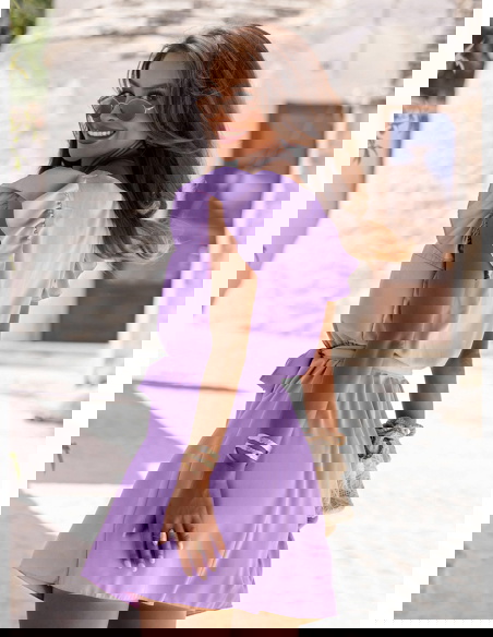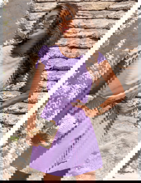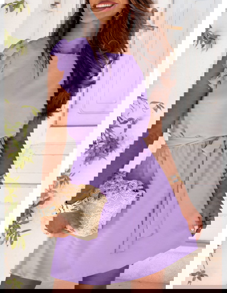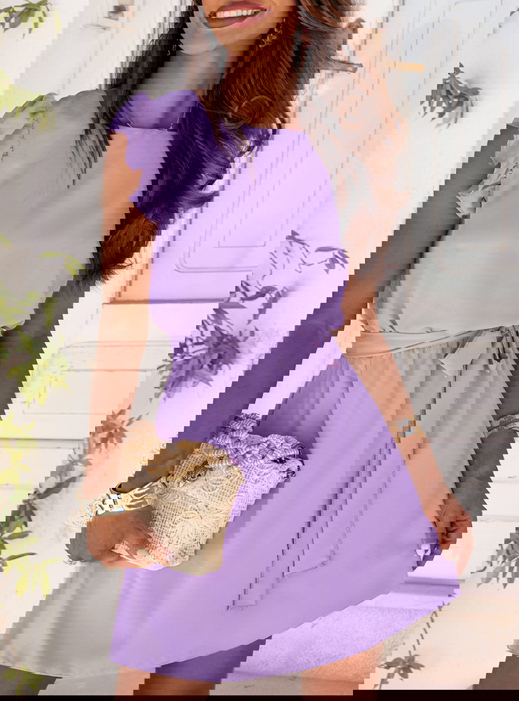 Liliowa sukienka z wiązaniem w talii Fiamma to lekka propozycja, która idealnie wpisuje się w letnie upały. Ten model z wiązaniem w talii pięknie podkreśla sylwetkę, dodając lekkości każdej stylizacji. Subtelne falbanki przy ramionach wprowadzają kobiecy akcent i subtelnie podkreślają linię ramion. Ukryte marszczenia w talii sprawiają, że każda figura zyskuje na proporcjach, a pasek można zawiązać według własnych preferencji. Klasyczny, okrągły dekolt zapewnia komfort i uniwersalność. Rozkloszowany dół sukienki delikatnie unosi się przy każdym kroku, tworząc dziewczęcy, radosny efekt. Fiamma zachwyca swoją prostotą, ale dzięki detalom — jak finezyjne marszczenia i wiązanie — zyskuje charakter centralnego punktu letniej garderoby.