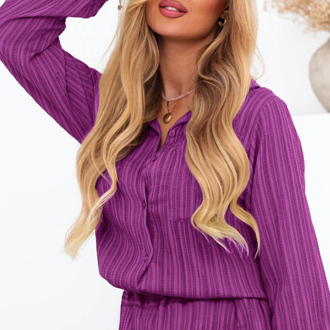Komplet koszula zapinana na guziki i spodnie Oracla - fuksja to propozycja dla kobiet, które lubią wyróżniać się kolorem, ale nie chcą rezygnować z elegancji. Ten zestaw emanuje energią i pewnością siebie, dodając stylizacji wyrazistości i kobiecego uroku. Fuksjowy odcień przyciąga wzrok i doskonale podkreśla urodę – niezależnie od typu karnacji. Klasyczna forma koszuli z guzikami świetnie komponuje się z luźnymi spodniami, tworząc nowoczesną, ale harmonijną całość. To komplet, który z powodzeniem możesz nosić zarówno w ciągu dnia, jak i wieczorem. Z jednej strony wygląda bardzo modnie i świeżo, z drugiej – jest niezwykle uniwersalny. Luźniejszy krój zapewnia komfort i swobodę, a intensywny kolor dodaje pewności siebie. Wystarczy dodać do niego ulubione dodatki, by stworzyć pełną osobowości stylizację. Ten zestaw z fuksjową nutą to prawdziwa perełka w kobiecej szafie – nowoczesna, kobieca i gotowa na każdą okazję.
