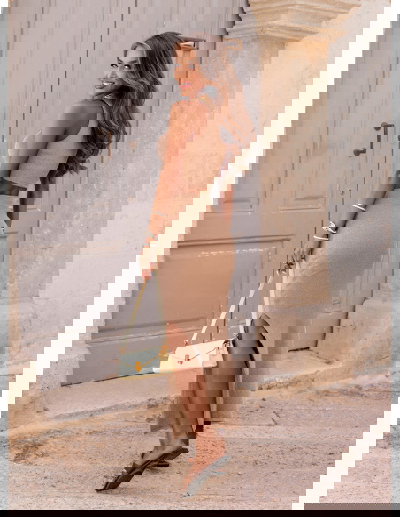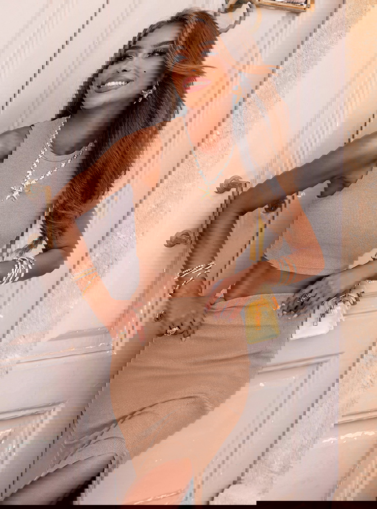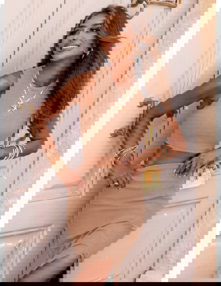 Beżowy prążkowany komplet top i spódnica z rozcięciem Vanya to komplet, który perfekcyjnie łączy minimalizm z kobiecą siłą. Z pozoru prosty fason skrywa w sobie maksimum stylu – top podkreślający ramiona i talię oraz dopasowana spódnica z zmysłowym rozcięciem tworzą duet idealny. To zestaw dla kobiet pewnych siebie, które cenią wygodę bez rezygnowania z efektu "wow". Prążkowana struktura materiału delikatnie opina ciało, eksponując atuty sylwetki w elegancki sposób. Bez zbędnych ozdobników – czysta forma, która daje nieskończone możliwości stylizacji. Vanya to esencja nowoczesnego szyku – idealna zarówno na miejskie wyjścia, jak i wakacyjne spacery po promenadzie.