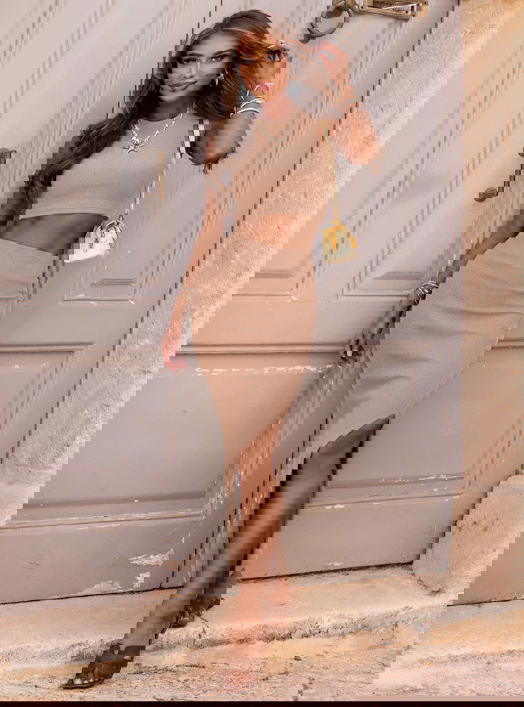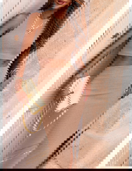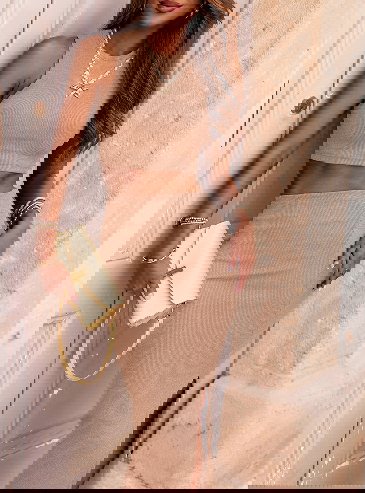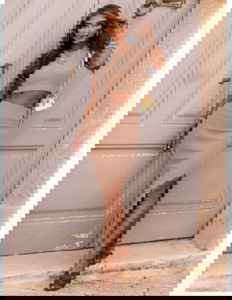 Beżowy prążkowany komplet top i spódnica z rozcięciem Vanya