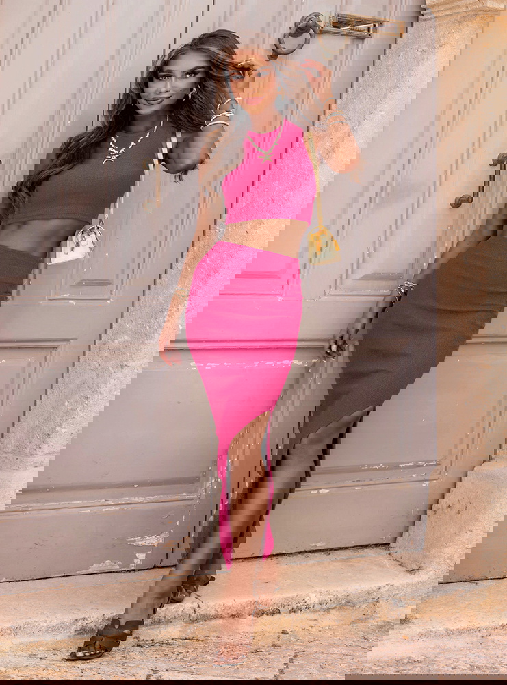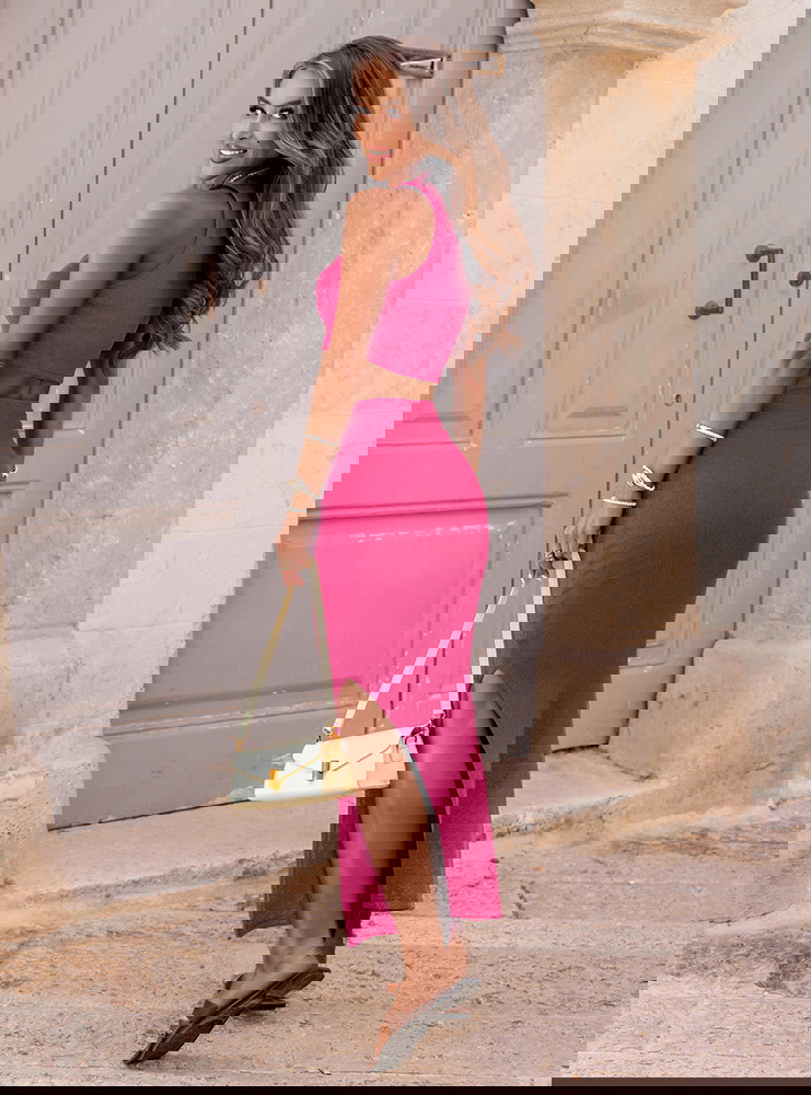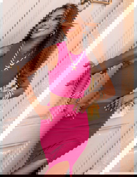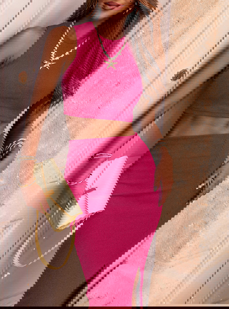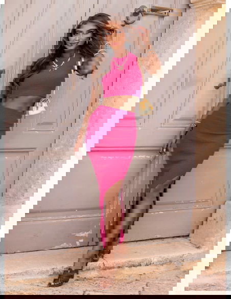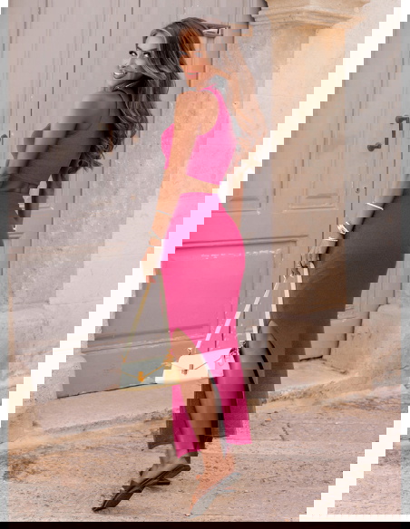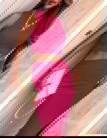Prążkowany komplet top i spódnica z rozcięciem Vanya - fuksja