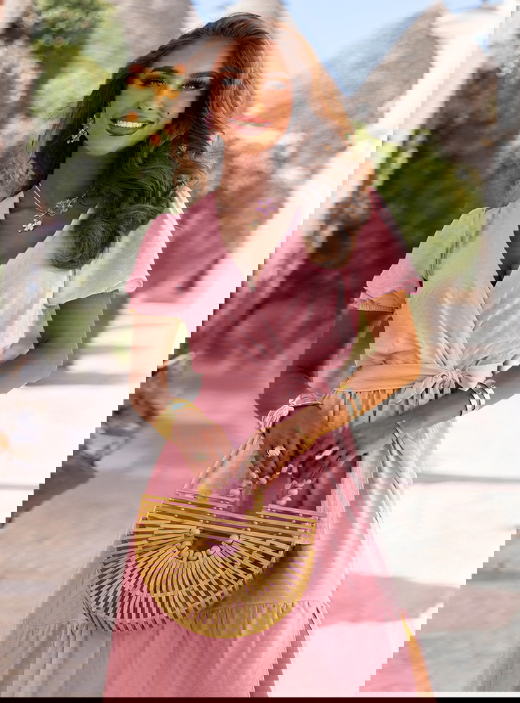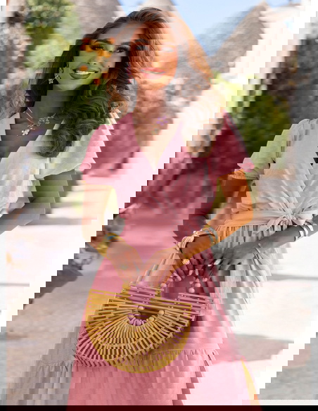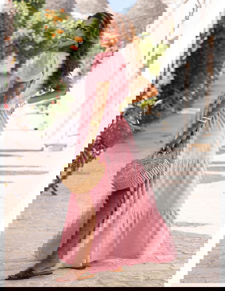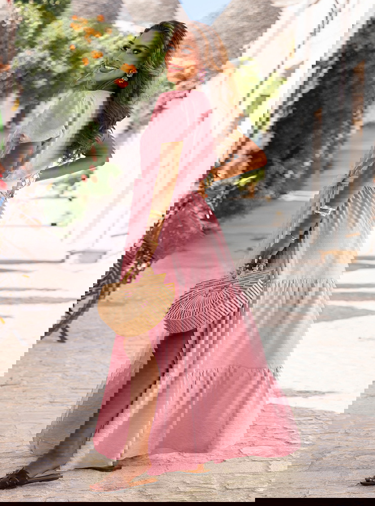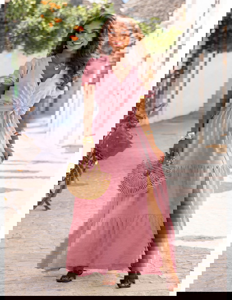 Długa rozkloszowana sukienka z przekładanym dekoltem Muriel - brudny róż to kwintesencja kobiecego uroku i letniej swobody. Już na pierwszy rzut oka zachwyca subtelnością koloru i romantycznym fasonem. Brudny róż to odcień, który doskonale podkreśla naturalną urodę i pasuje niemal do każdego typu karnacji. Sukienka wyróżnia się przepięknym, przekładanym dekoltem, który delikatnie eksponuje szyję i dekolt, dodając kobiecości. Wiązanie w talii pięknie modeluje sylwetkę, podkreślając jej proporcje. Długość maxi oraz rozkloszowany dół nadają stylizacji lekkości i zjawiskowego efektu w ruchu. To idealna propozycja na letnie dni – komfortowa, zwiewna i zawsze stylowa. Rękawy z subtelnym marszczeniem dodają uroku i lekko vintage’owego charakteru. Całość tworzy spójną, romantyczną stylizację, w której nie sposób przejść niezauważoną. Ta sukienka to doskonały wybór dla każdej kobiety, która chce wyglądać elegancko, ale czuć się swobodnie.