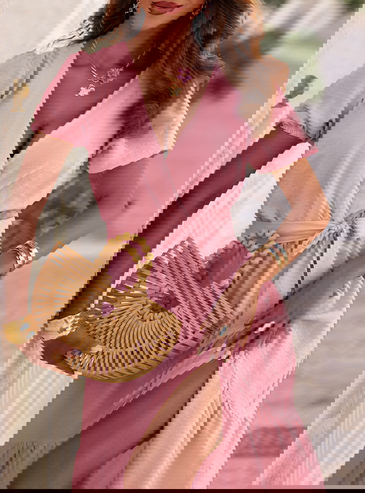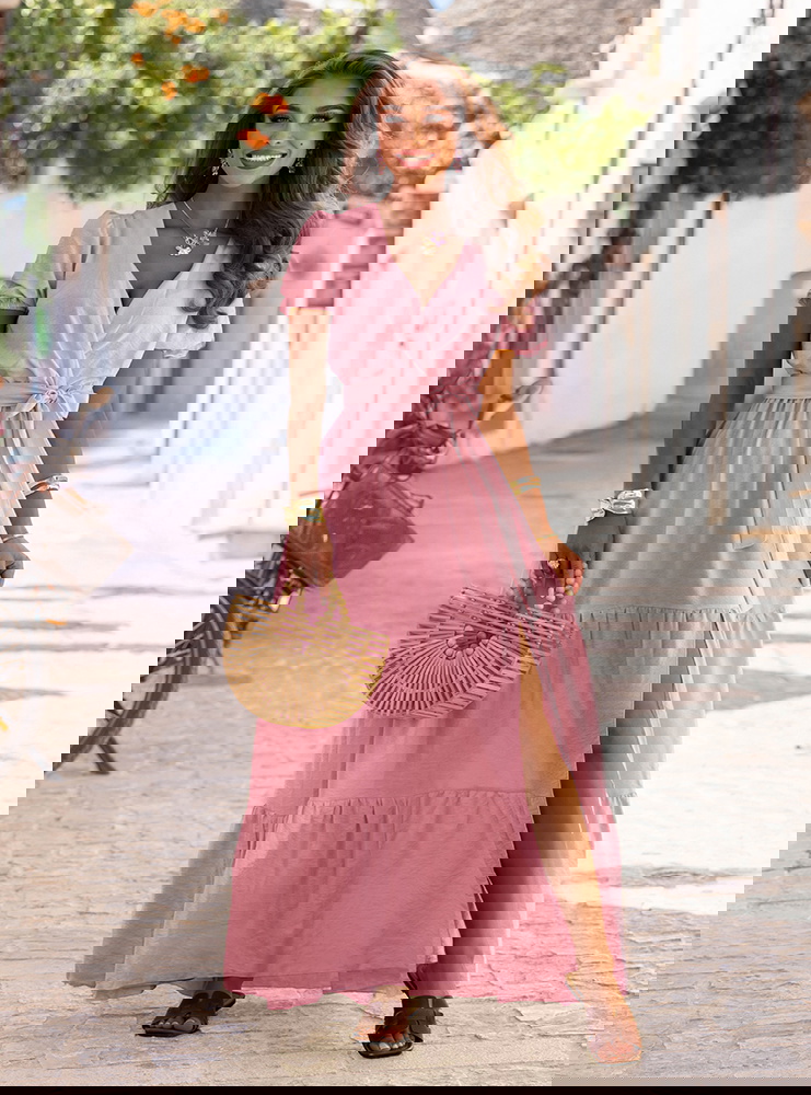 Długa rozkloszowana sukienka z przekładanym dekoltem Muriel - brudny róż to harmonijne połączenie kobiecości, swobody i stylu. Jej przekładany dekolt oraz wiązanie w talii pięknie podkreślają atuty sylwetki.