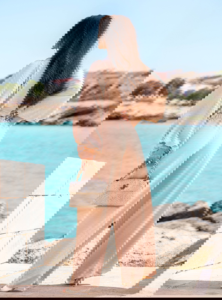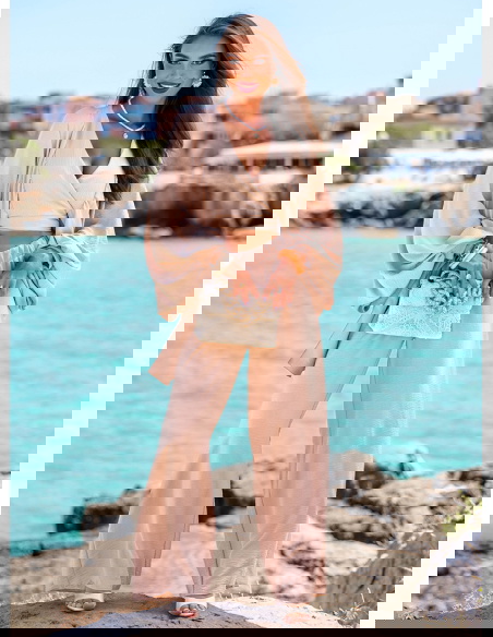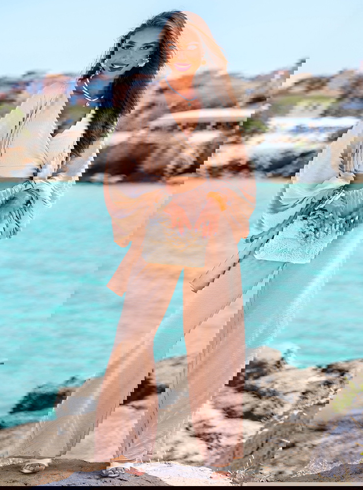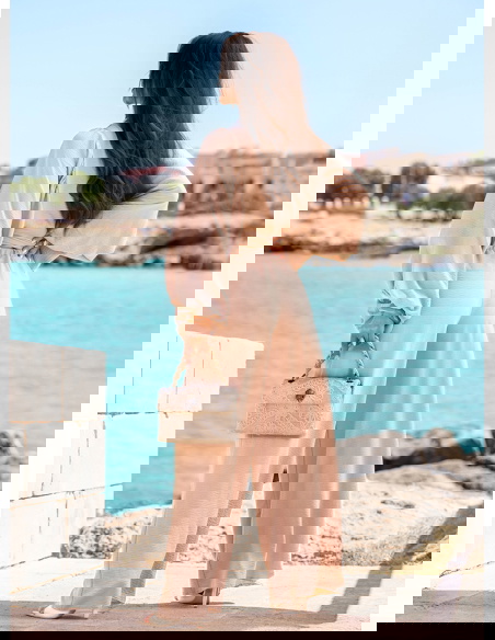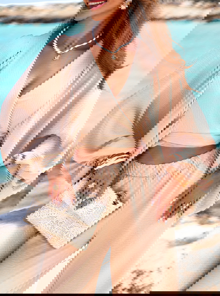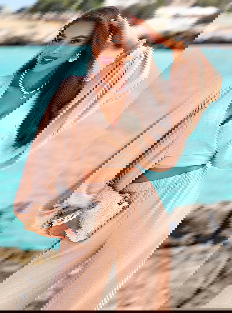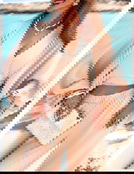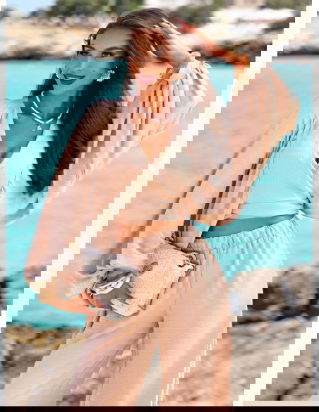 Beżowy komplet top z bufiastymi rękawami i szerokie spodnie Lexille to idealna propozycja dla kobiet, które kochają stylizacje z charakterem, ale bez zbędnego przepychu. Już na pierwszy rzut oka zachwyca efektownym fasonem i wyjątkowym wykończeniem. Top o kroju kopertowym z długimi, bufiastymi rękawami prezentuje się niezwykle kobieco i zmysłowo. Głębszy dekolt pięknie eksponuje szyję i dekolt, a długość topu optycznie wydłuża sylwetkę. Spodnie z wysokim stanem i szeroką nogawką nie tylko zapewniają komfort, ale też dodają stylizacji elegancji i lekkości. Beżowy odcień nadaje całości subtelnego uroku i świetnie komponuje się z opalenizną oraz wakacyjnym klimatem. Ten zestaw to doskonały wybór na lato, gdy chcemy wyglądać stylowo, a jednocześnie czuć się swobodnie. Stylizacja prezentuje się świetnie zarówno w ruchu, jak i na zdjęciach – co czyni ją idealną na wakacyjne wyjazdy. Jeśli szukasz kompletnej stylizacji, która podkreśli Twoją kobiecość i przyciągnie spojrzenia – ten zestaw będzie strzałem w dziesiątkę.