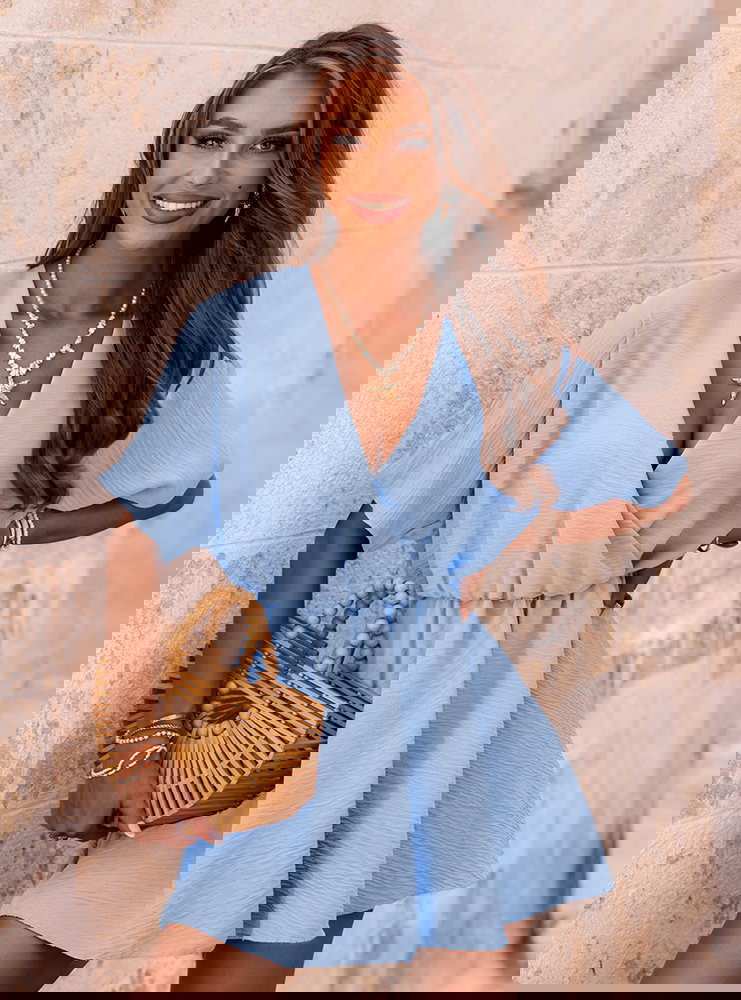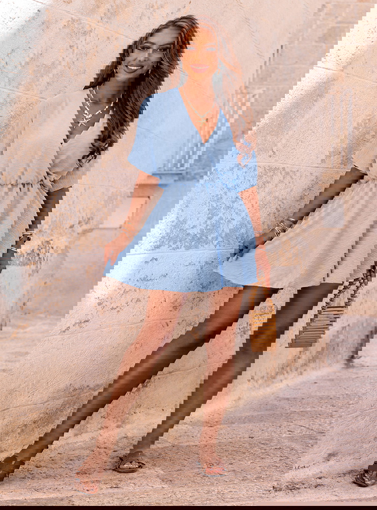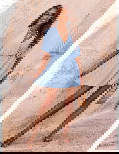 Błękitny kombinezon jak sukienka z przekładanym dekoltem Violleta to wyjątkowo kobieca propozycja, która łączy w sobie swobodę noszenia i efektowny wygląd. Na pierwszy rzut oka przypomina lekką, rozkloszowaną sukienkę, ale połączenie wygodnych szortów z luźną górą sprawia, że to idealna opcja dla kobiet, które cenią komfort i styl. Delikatny odcień błękitu wprowadza świeżość i lekkość do każdej stylizacji, doskonale podkreślając letni klimat. Kopertowy dekolt pięknie modeluje górę sylwetki i subtelnie eksponuje dekolt. Luźne rękawy oraz lekko marszczona talia podkreślają proporcje i nadają sylwetce kobiecości. To model, który świetnie wygląda w ruchu – lekki, zwiewny i stylowy. Świetnie sprawdzi się zarówno na co dzień, jak i na wakacyjnych wyjazdach. Kombinezon daje pełną swobodę ruchu i wygląda niezwykle dziewczęco. Jeśli szukasz czegoś lekkiego, uniwersalnego i uroczego – ten model będzie idealnym wyborem.