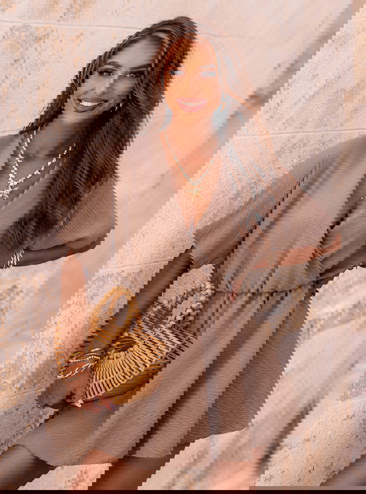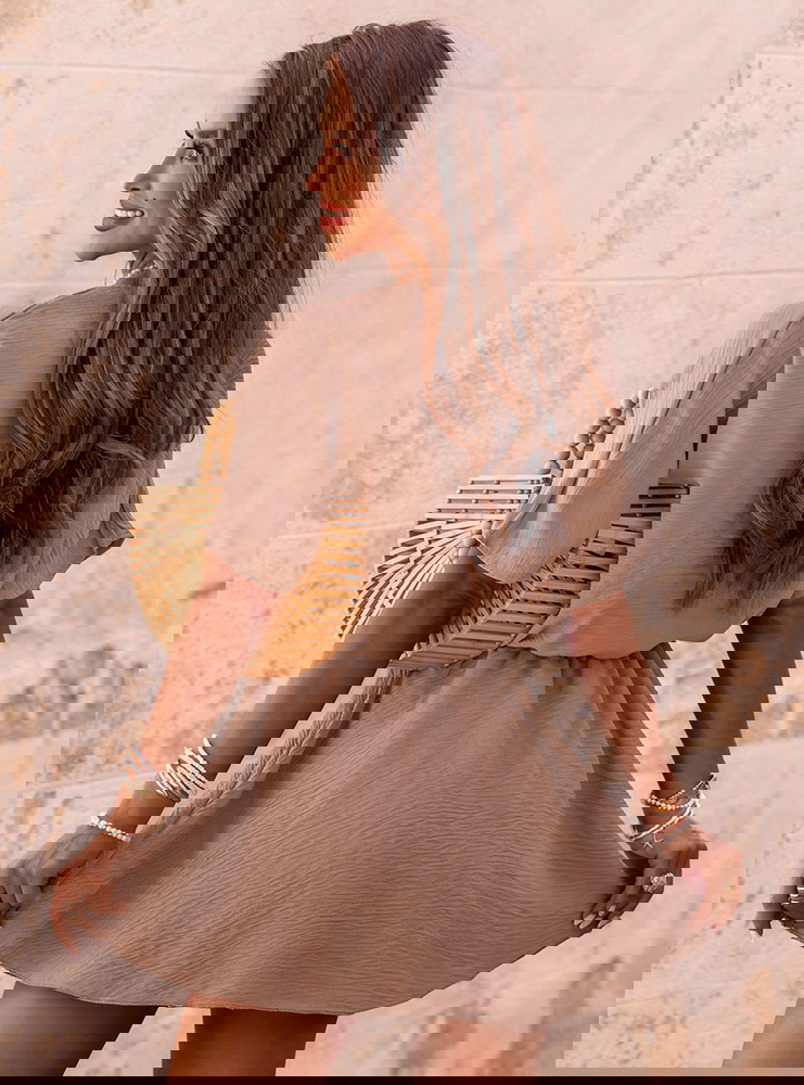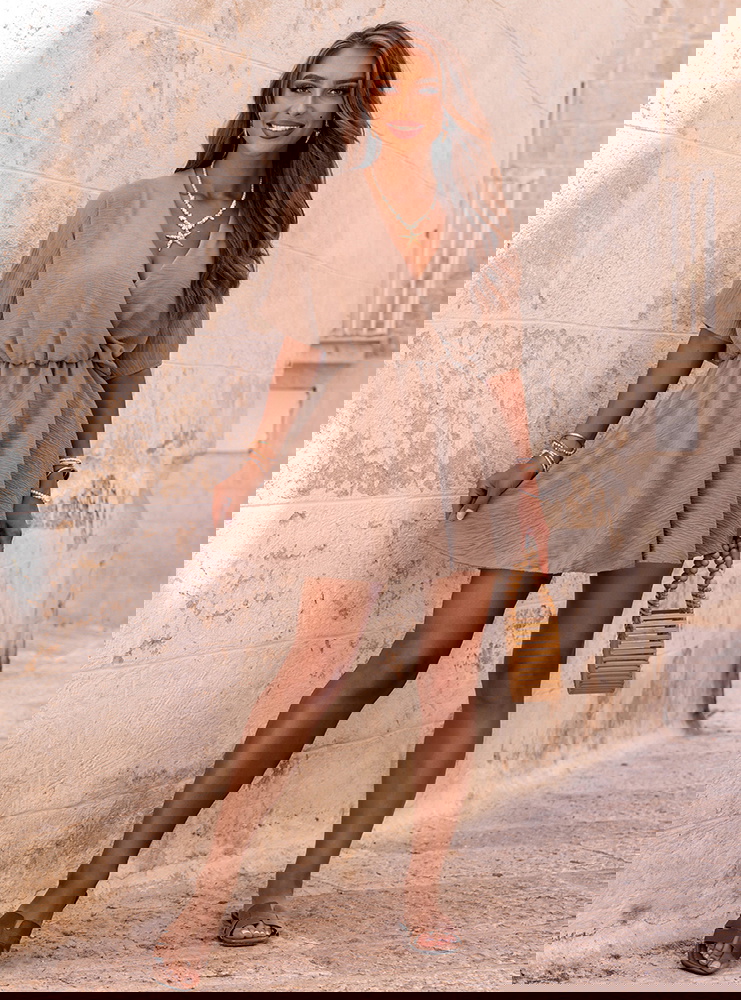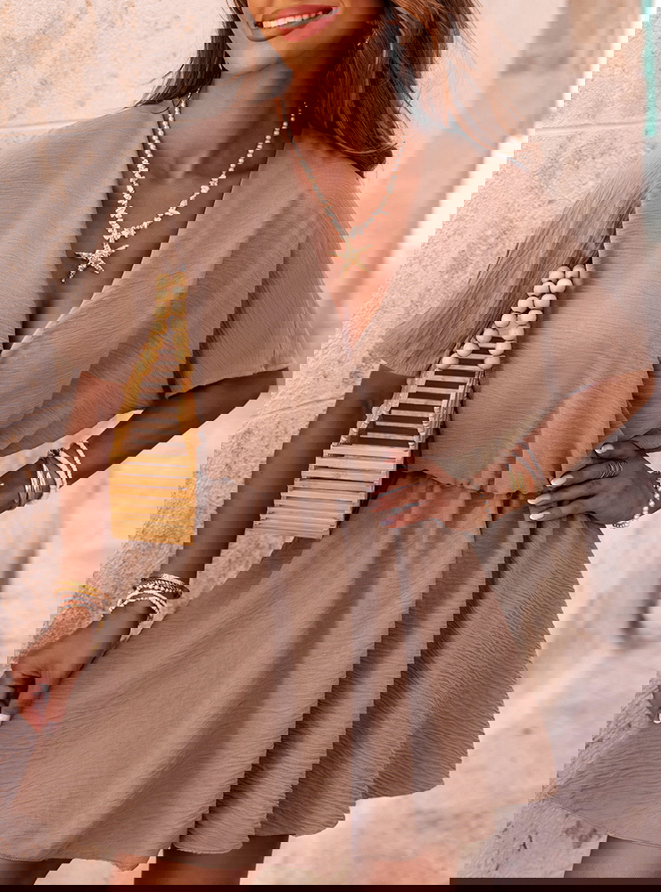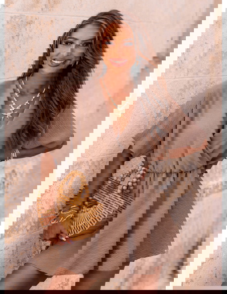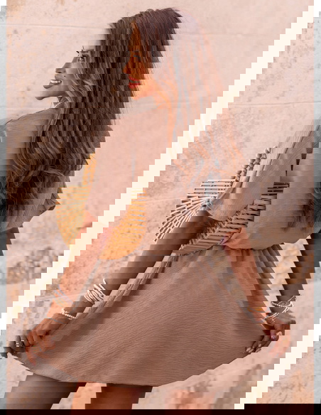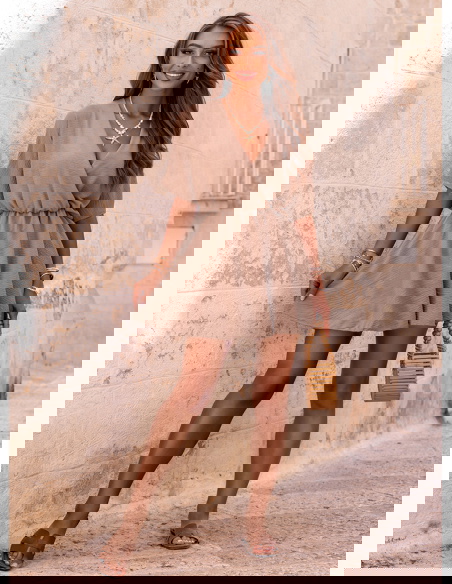 Kombinezon jak sukienka z przekładanym dekoltem Violleta - mocha mousse to doskonała propozycja dla kobiet, które cenią wygodę i styl w jednym. Jego lekki, zwiewny krój do złudzenia przypomina sukienkę, ale ukryte w środku szorty sprawiają, że możesz czuć się w nim całkowicie swobodnie. Kolor mocha mousse – ciepły, stonowany odcień brązu – dodaje całości elegancji i świetnie komponuje się zarówno z jasnymi, jak i bardziej wyrazistymi dodatkami. Przekładany dekolt pięknie eksponuje szyję i dekolt, dodając kobiecego charakteru. Luźne rękawki i elastyczna talia to gwarancja wygody przez cały dzień. To model, który wygląda świetnie w ruchu, a jego forma jest nie tylko stylowa, ale też praktyczna. Idealnie sprawdzi się zarówno na co dzień, jak i na wakacyjne wyjazdy. Dzięki temu, że wygląda jak sukienka, ale ma wygodę kombinezonu – masz wszystko, czego potrzebujesz w jednej stylizacji. Jeśli szukasz czegoś modnego, ale wciąż komfortowego, ten kombinezon z pewnością spełni Twoje oczekiwania.