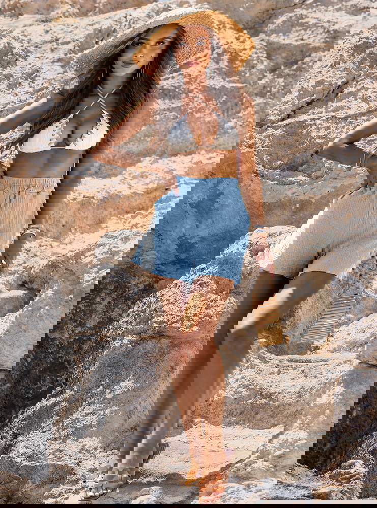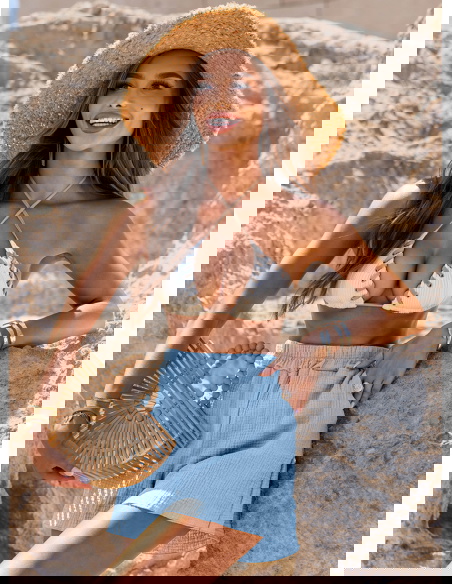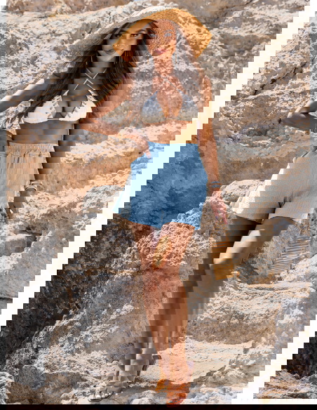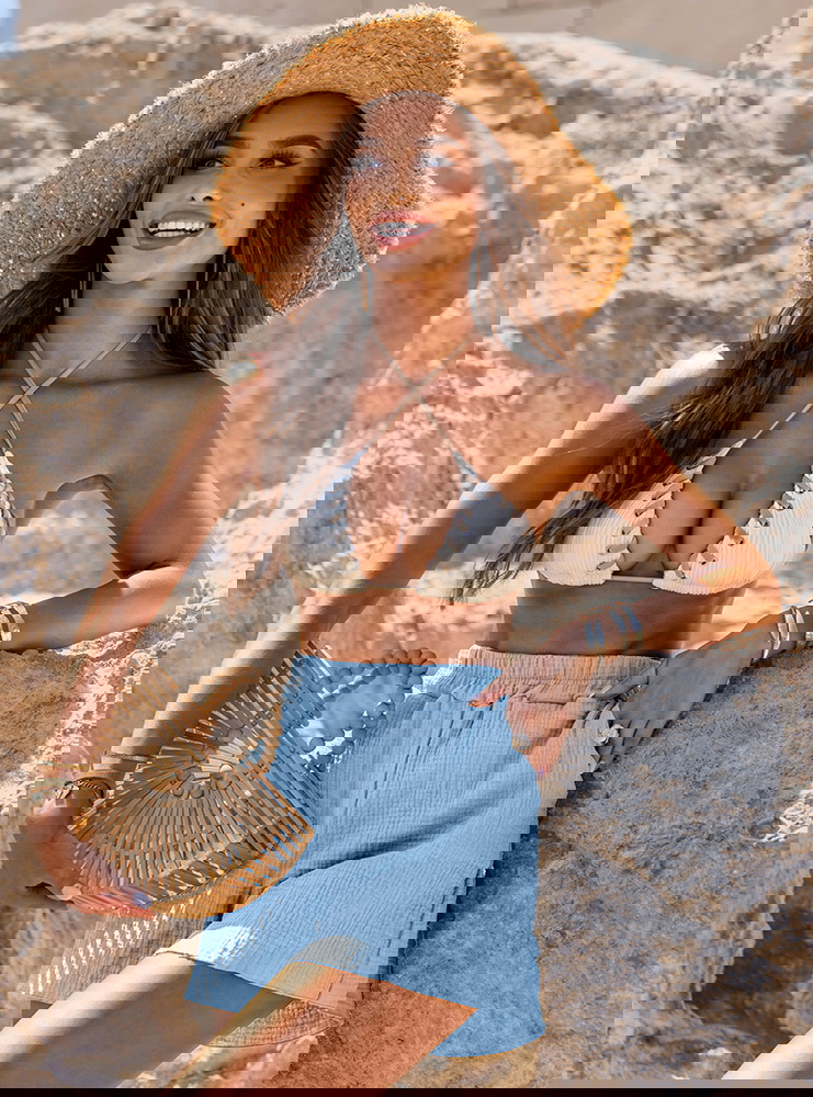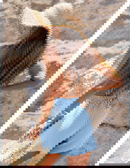 Błękitne luźne spodenki z kieszeniami Minervina to must-have w letniej garderobie każdej kobiety ceniącej wygodę i styl. Ich lekkość i swobodny krój sprawiają, że są idealne na ciepłe, słoneczne dni – zarówno na plaży, jak i podczas miejskich spacerów. Błękitny kolor wprowadza nutę świeżości, kojarząc się z wakacjami i beztroską atmosferą. Spodenki mają praktyczny fason z elastyczną talią, co gwarantuje komfort noszenia przez cały dzień. Ich długość i luźna forma pozwalają na swobodę ruchu, a jednocześnie prezentują się bardzo kobieco i stylowo. Dodatkowe kieszenie nie tylko podnoszą funkcjonalność, ale też dodają casualowego charakteru. To świetna baza do letnich stylizacji – wystarczy prosty top, kostium kąpielowy lub bluzka, by stworzyć gotowy look. Ich delikatna, lekko strukturalna faktura nadaje całości uroku i naturalnego luzu. Te spodenki sprawią, że poczujesz się wygodnie i lekko niezależnie od tego, gdzie jesteś. To model, który aż chce się spakować na każdą wakacyjną wyprawę.