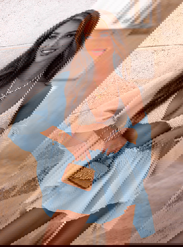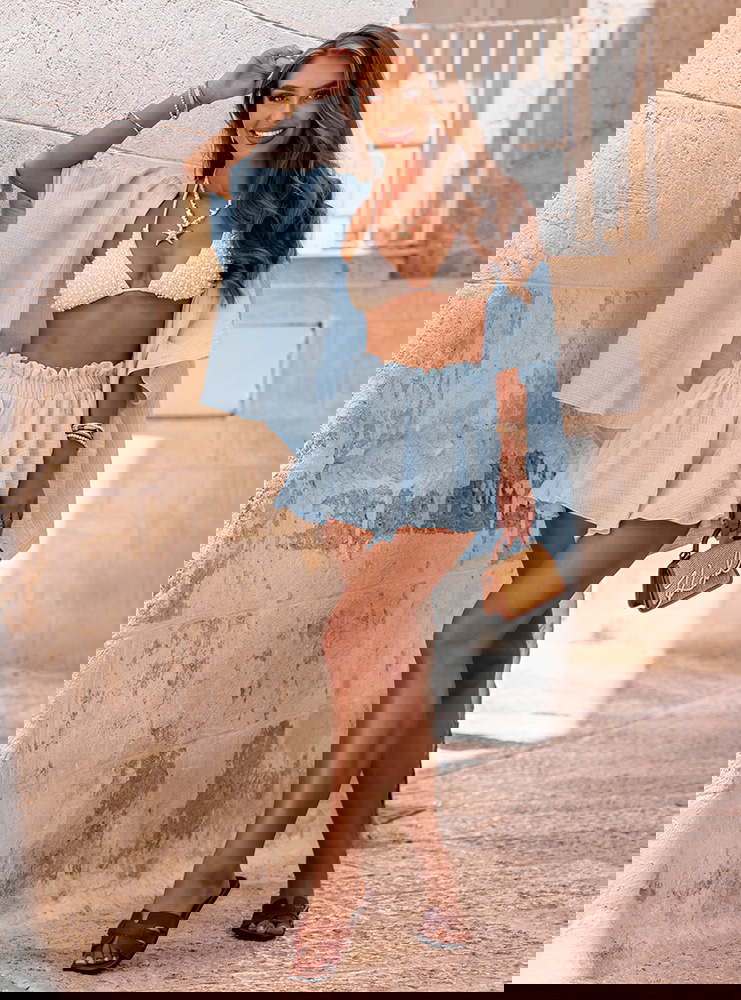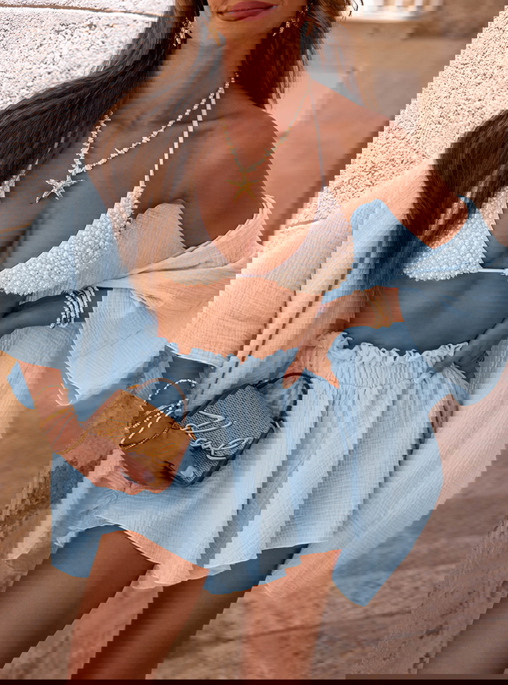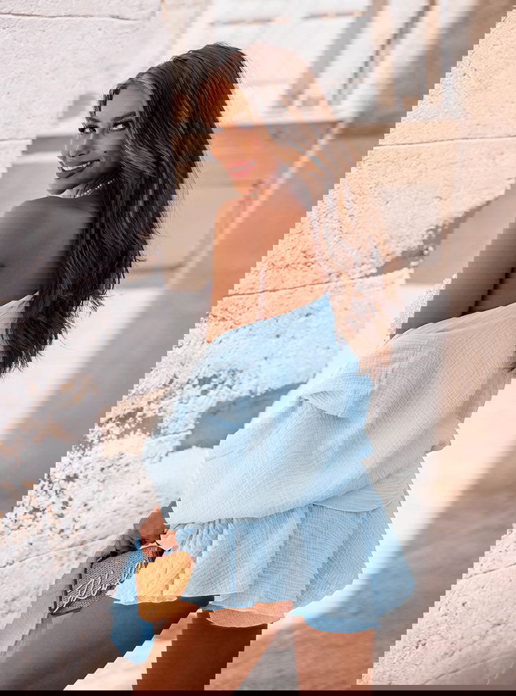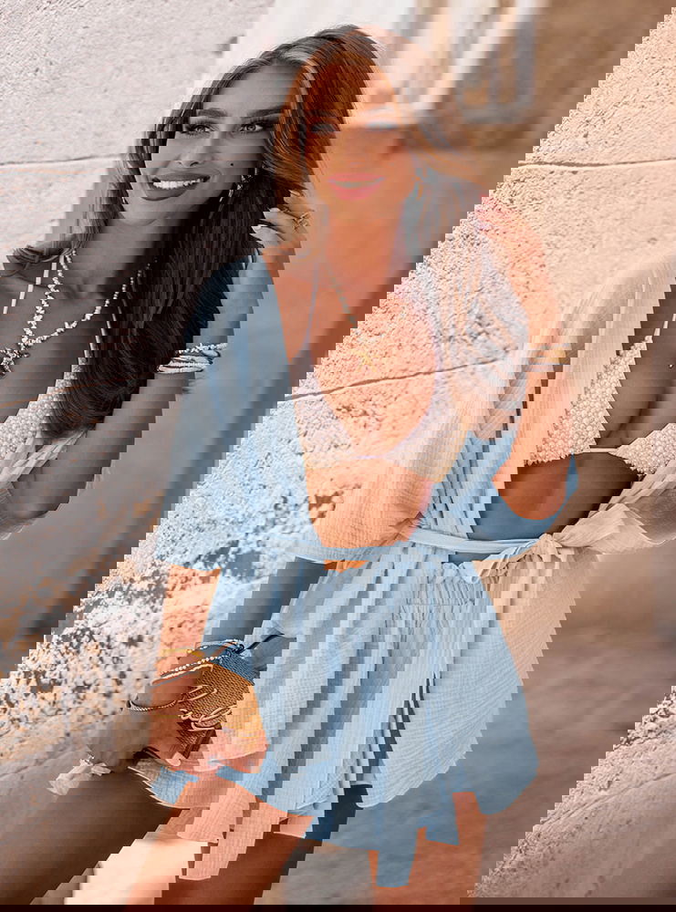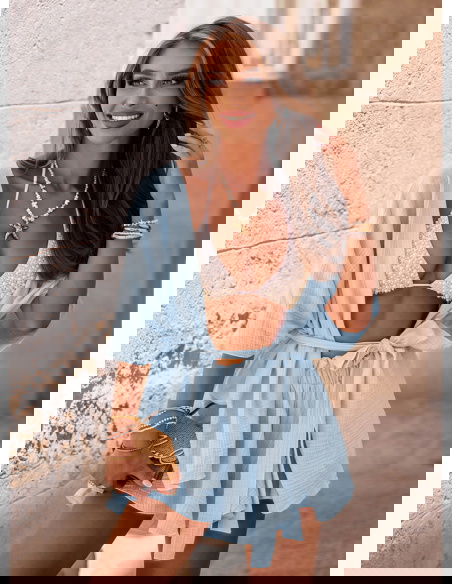 Błękitny komplet narzutka z wiązaniem i spodenki Elisabetta to idealna propozycja na letnie dni, która łączy styl, wygodę i kobiecy urok. Lekka tkanina delikatnie otula sylwetkę, zapewniając komfort i przewiewność nawet w największe upały. Narzutka ma luźny krój i wiązanie w talii, które możesz dopasować do swojej figury. Błękitny odcień dodaje świeżości i sprawia, że całość prezentuje się bardzo subtelnie i dziewczęco. Spodenki z elastycznym pasem idealnie leżą, nie uciskają i pięknie układają się na nogach. Całość została uszyta z miękkiego, strukturalnego muślinu – tkaniny, która podkreśla lekkość i wakacyjny klimat zestawu. To komplet, który sprawdzi się zarówno jako stylizacja na plażę, jak i na letnie spacery po mieście. Można go zestawić z bikini, topem lub nosić osobno – tworząc niezliczone letnie stylizacje. Prosty, ale przemyślany krój nadaje sylwetce lekkości i swobody. To must-have w każdej letniej garderobie, który nie tylko świetnie wygląda, ale też daje pełną swobodę ruchów.