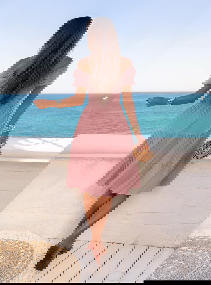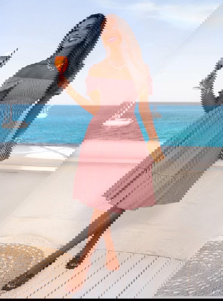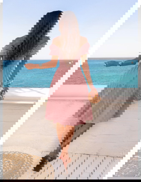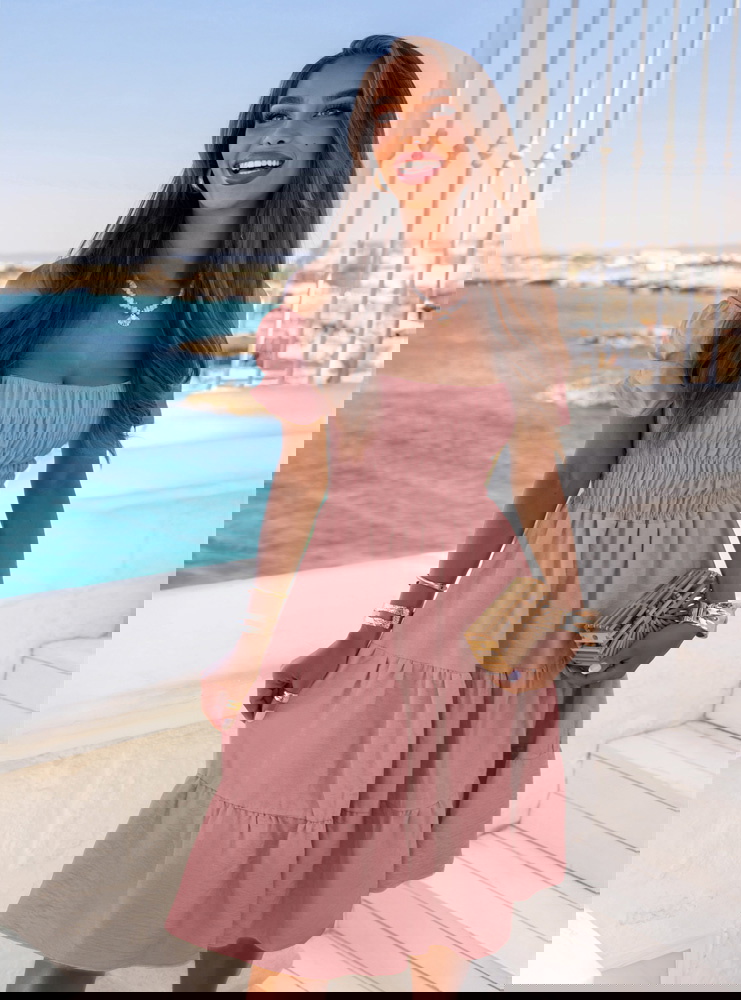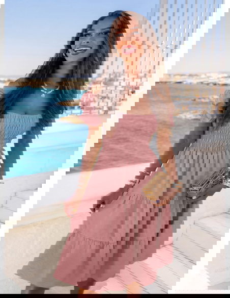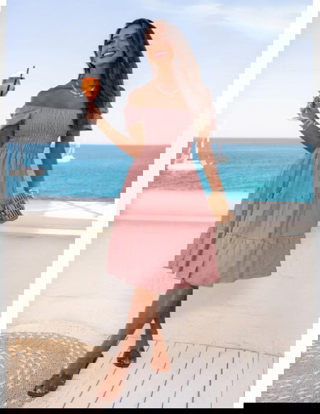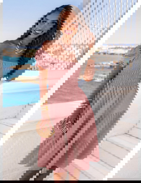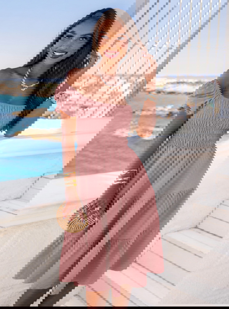 Sukienka midi typu hiszpanka Melindaa - brudny róż jest idealna na letnie wyjścia, spacery, randki czy spotkania z przyjaciółmi. Doskonała także na wakacyjny wyjazd, festiwal lub garden party.