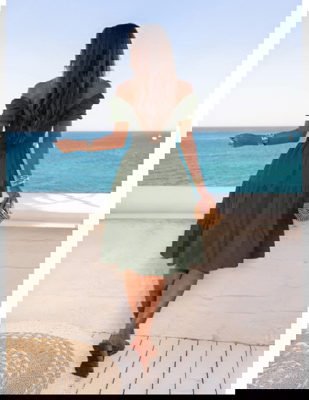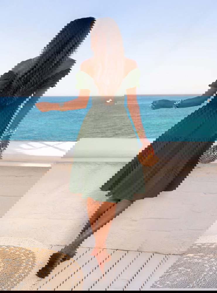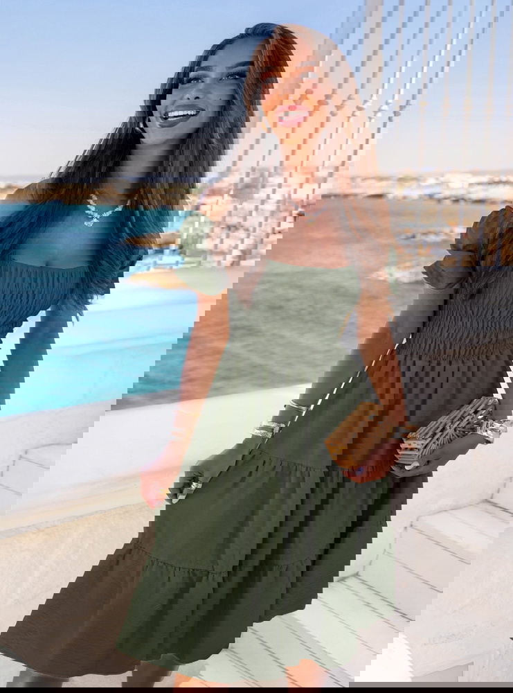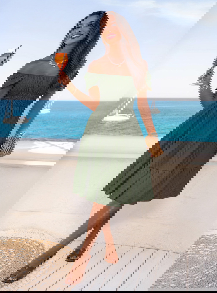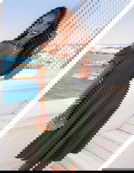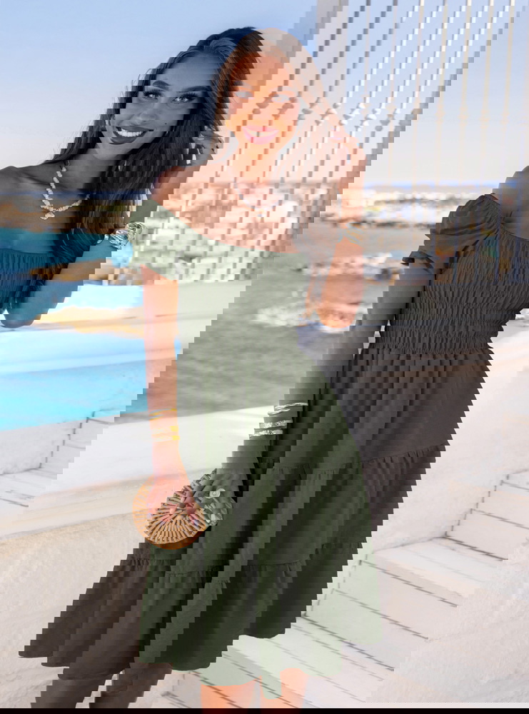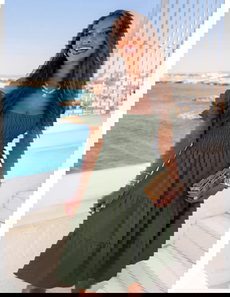 Sukienka midi typu hiszpanka Melindaa - khaki świetnie sprawdzi się na wakacjach, podczas spacerów po plaży czy letnich festiwali. Jest idealna na spotkania ze znajomymi, garden party, a także niezobowiązujące randki.