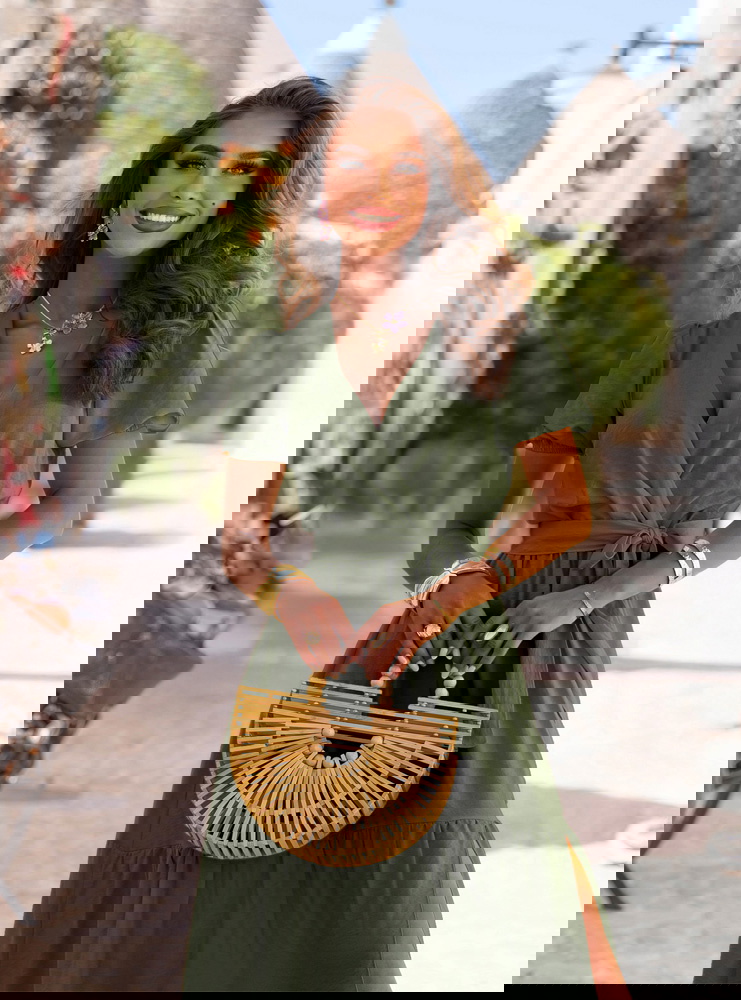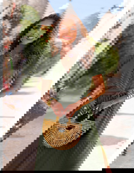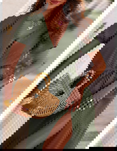 Długa rozkloszowana sukienka z przekładanym dekoltem Muriel - khaki to model, który łączy w sobie ponadczasową elegancję z wygodą noszenia. Głęboki, ziemisty odcień khaki pięknie współgra z naturalnym otoczeniem, dodając stylizacjom spokojnej, ale zdecydowanej energii. To sukienka, która świetnie sprawdzi się zarówno na co dzień, jak i podczas wyjątkowych okazji. Rozkloszowany dół z delikatnymi falbanami tworzy subtelny efekt lekkości i zwiewności. Przekładany dekolt optycznie wysmukla sylwetkę i nadaje kobiecości, jednocześnie pozostając komfortowym rozwiązaniem. Pasek wiązany w talii pozwala dopasować fason do figury i pięknie ją podkreśla. Krótkie rękawki z delikatnym bufkiem dopełniają całości, dodając sukience romantycznego charakteru. Długość maxi z rozcięciem z przodu to idealne rozwiązanie, by dodać całości lekkości i zmysłowego akcentu. To stylizacja, która wygląda dobrze niezależnie od sytuacji – prosta, ale efektowna. Jeśli lubisz czuć się kobieco, wygodnie i modnie – ta sukienka będzie Twoją nową ulubioną.