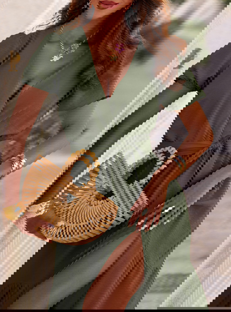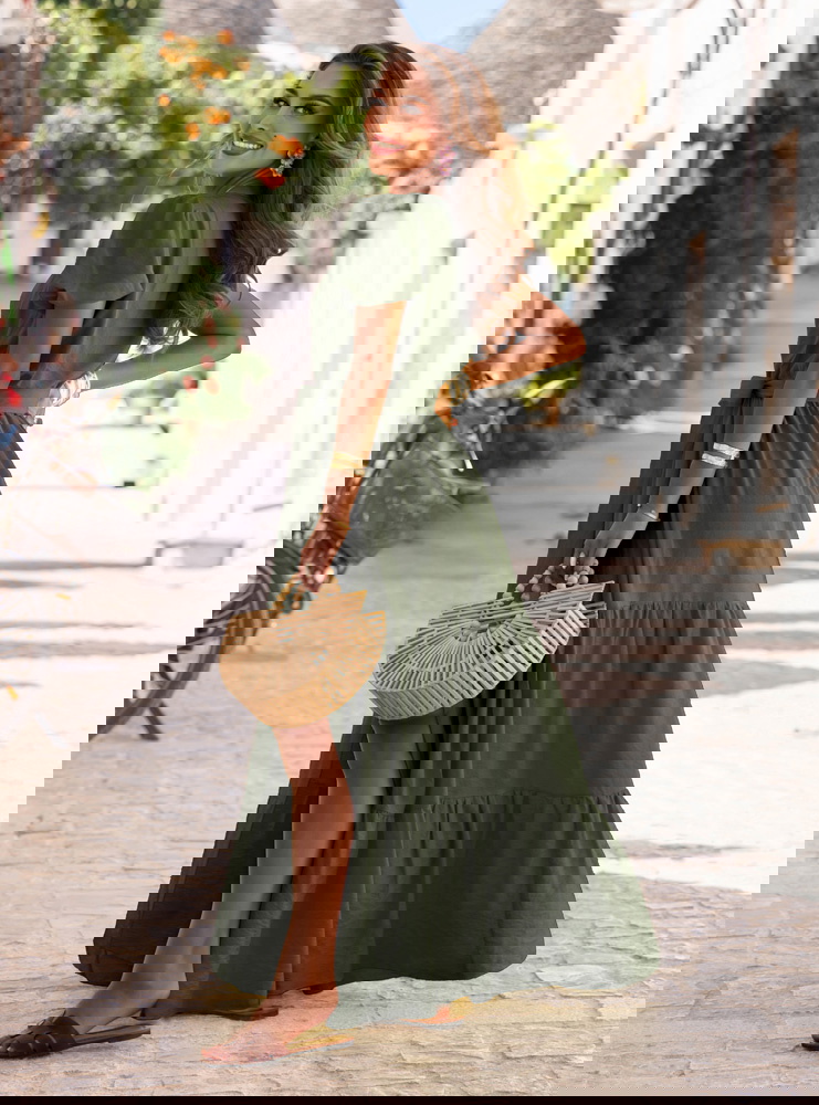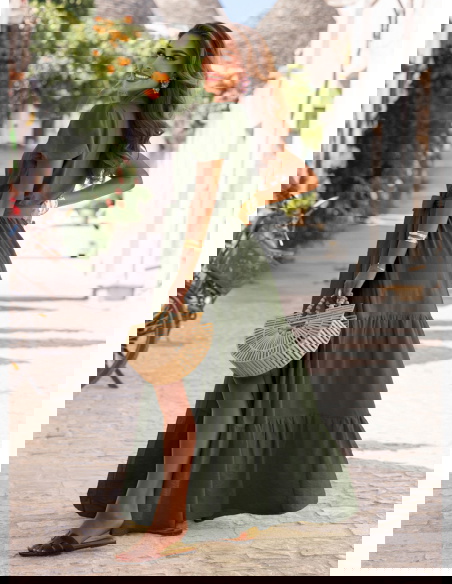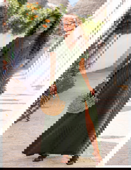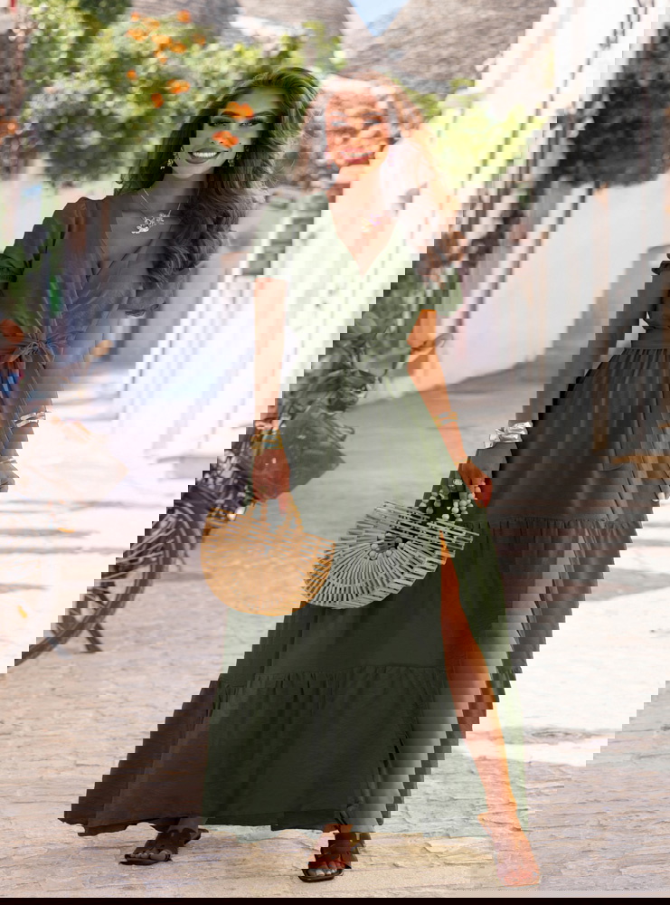 Długa rozkloszowana sukienka z przekładanym dekoltem Muriel - khaki doskonale sprawdzi się na letnie spacery, wyjścia do kawiarni czy spotkania z przyjaciółmi. Jest świetną opcją na wakacje – zarówno do noszenia w dzień, jak i na wieczorne kolacje.