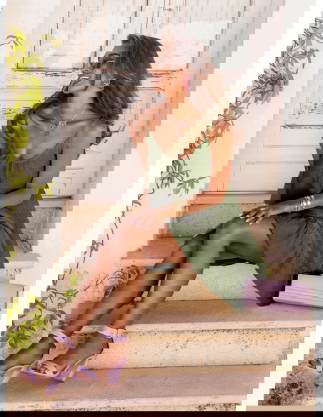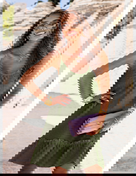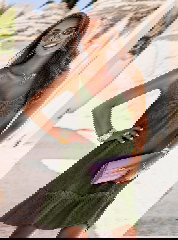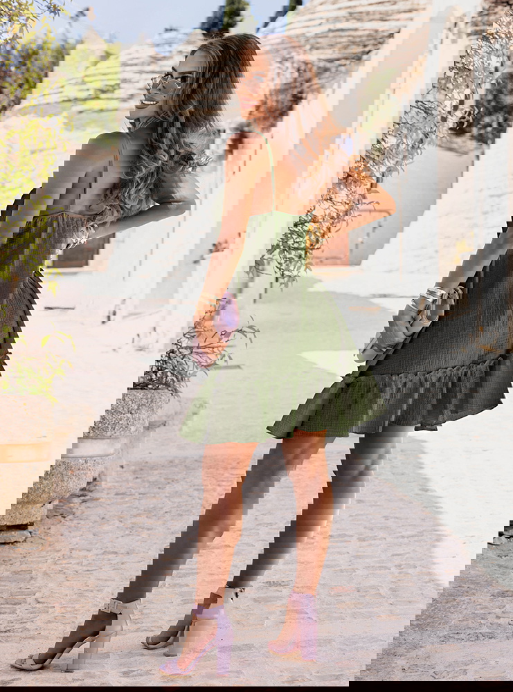 Rozkloszowana sukienka mini na ramiączkach Rachele - khaki to lekka, letnia propozycja stworzona z myślą o ciepłych dniach i swobodnych, kobiecych stylizacjach. Jej krój sprawia, że wygląda niezwykle dziewczęco, a jednocześnie zapewnia pełen komfort noszenia. Subtelnie wyeksponowane ramiona, delikatny dekolt i zwiewny dół z falbaną tworzą razem harmonijną całość, która podkreśla lekkość sylwetki. Kolor khaki to idealna alternatywa dla klasycznych barw – dodaje stylizacji naturalności, świeżości i luzu. Ramiączka sprawiają, że całość nabiera wakacyjnego charakteru i świetnie sprawdza się zarówno w miejskich, jak i plażowych klimatach. To sukienka, która nie tylko wygląda pięknie, ale też daje Ci swobodę w każdej sytuacji. Łatwo ją wystylizować – pasuje zarówno do espadryli i słomkowego kapelusza, jak i do sandałów na obcasie i eleganckiej torebki. Idealna dla kobiet, które szukają prostoty w kobiecym wydaniu. Ta sukienka to letni must-have, który zagości w Twoich stylizacjach na wiele okazji.