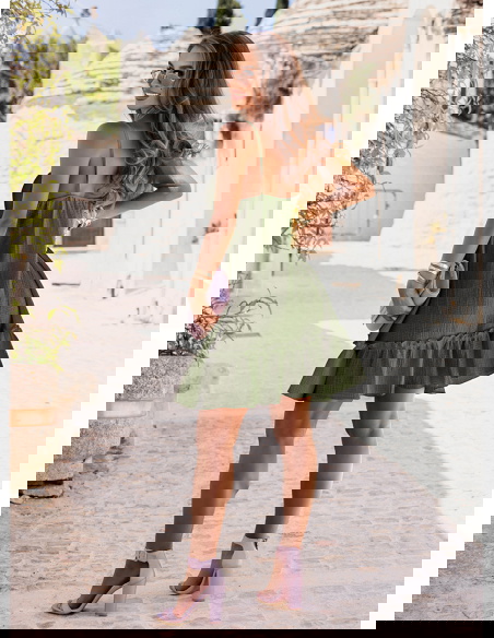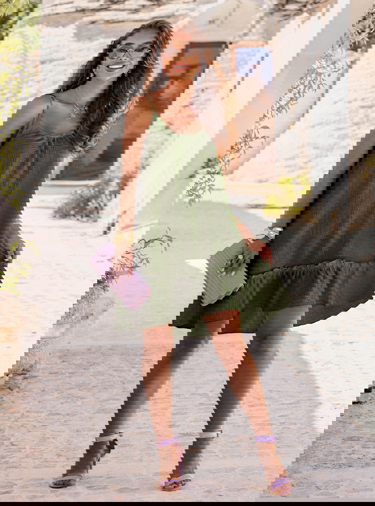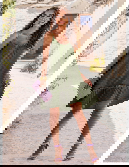 Rozkloszowana sukienka mini na ramiączkach Rachele - khaki to połączenie wygody i kobiecego stylu. Jej lekki fason zapewnia przewiewność i komfort, a jednocześnie sprawia, że każda sylwetka wygląda świeżo i subtelnie.