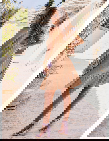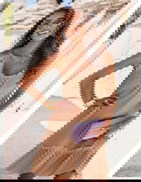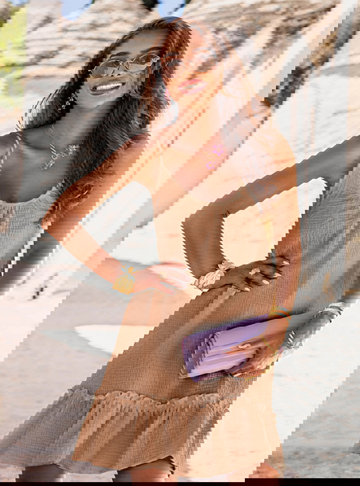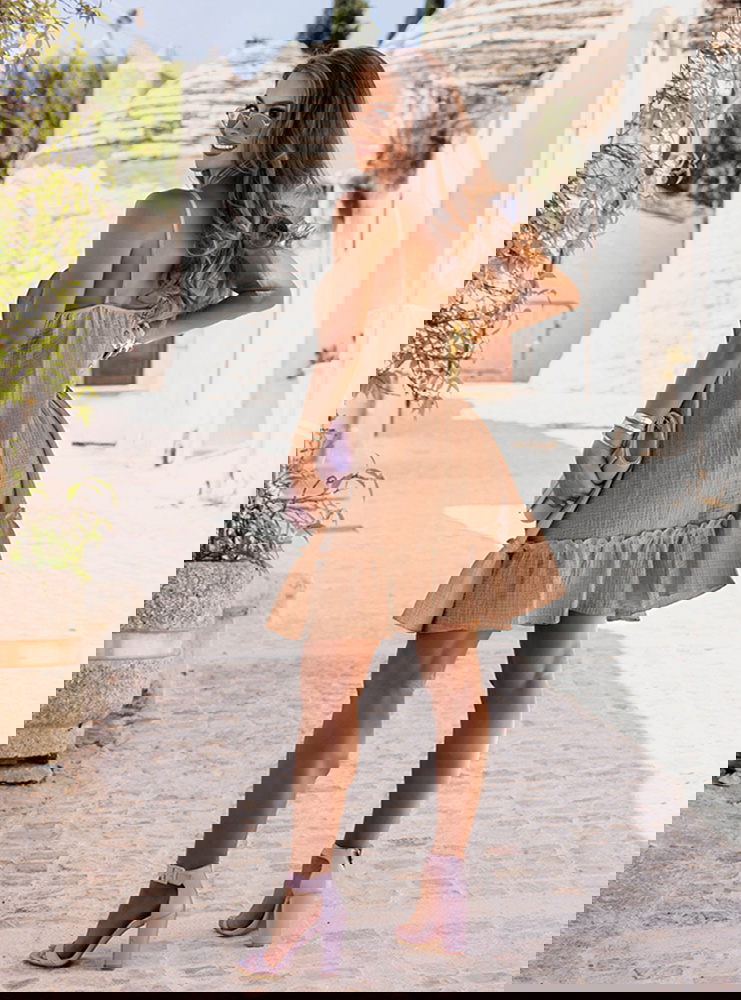 Rozkloszowana sukienka mini na ramiączkach Rachele - mocha mousse to sukienka, którą z łatwością zabierzesz ze sobą na każdy letni wyjazd. Wystarczy dodać ulubione dodatki i gotowe – stylizacja pełna uroku gotowa!