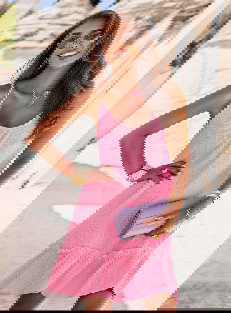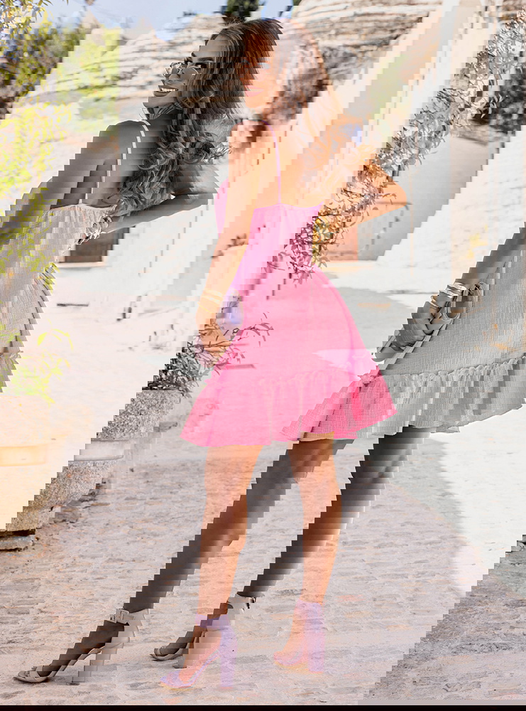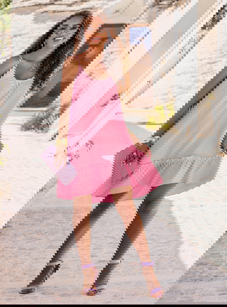 Różowa rozkloszowana sukienka mini na ramiączkach Rachele to model, który pokochasz za wygodę, ale też za to, jak pięknie się prezentuje. Świetnie wpisuje się w letnie stylizacje, dodając im świeżości.