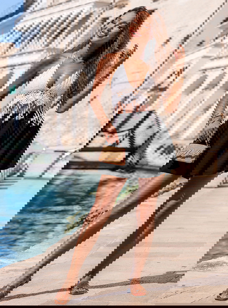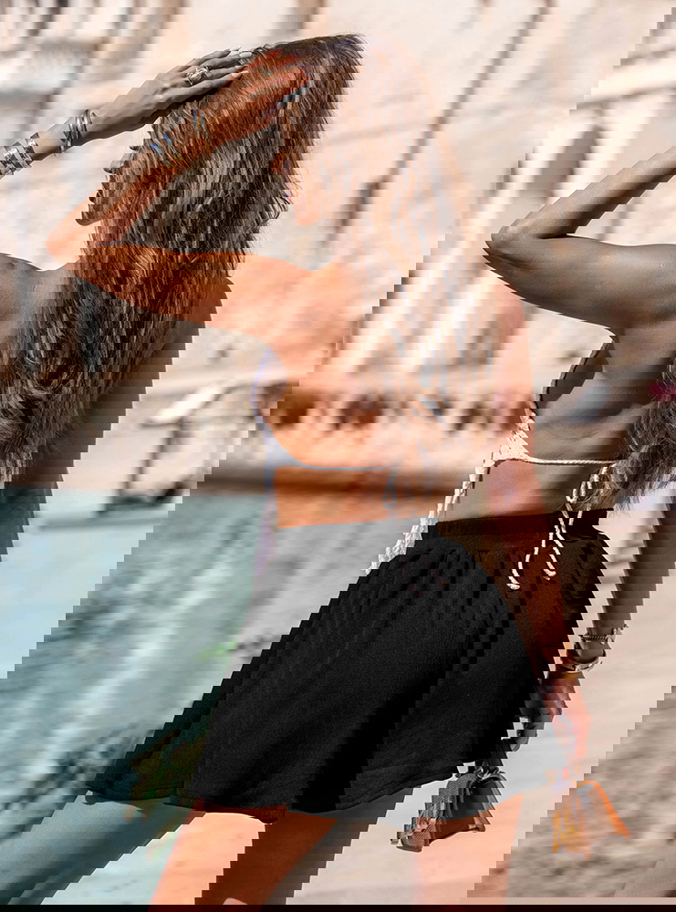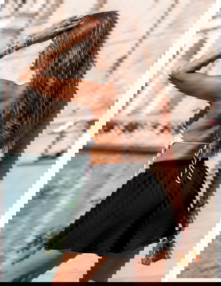 Czarne prążkowane spodenki z gumką w pasie Aretusa idealnie sprawdzą się na wakacyjnych wyjazdach – zarówno podczas spacerów po plaży, jak i miejskich eksploracji. Możesz je założyć na letnie spotkanie z przyjaciółkami, piknik w parku czy festiwal.