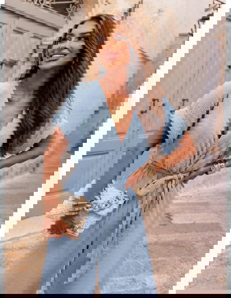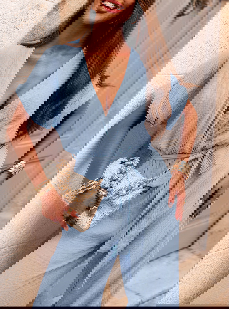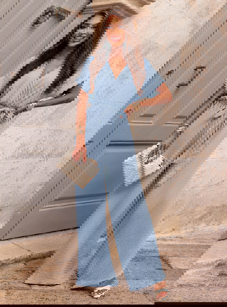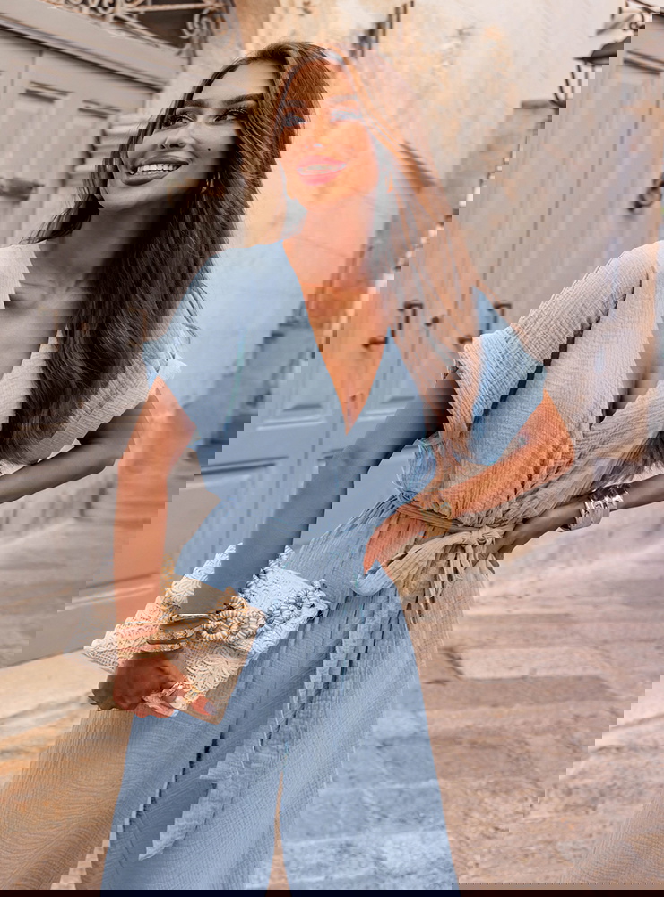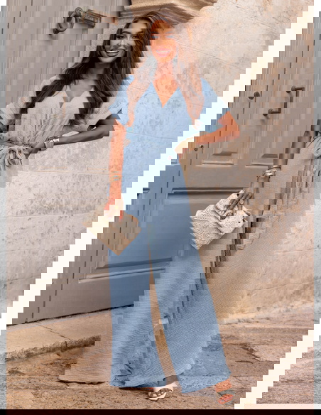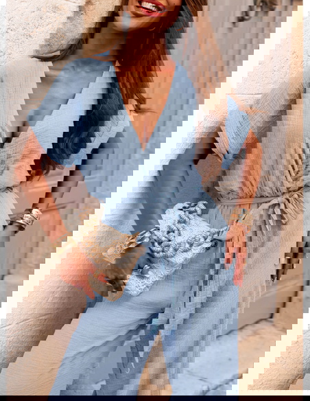 Błękitny kombinezon z długimi nogawkami Adelasia to doskonała propozycja dla kobiet, które cenią sobie wygodę połączoną z subtelną elegancją. Już na pierwszy rzut oka zachwyca prostą, ale efektowną formą. Kolor błękitu dodaje świeżości i lekkości, przyciągając uwagę w bardzo naturalny sposób. Kombinezon świetnie układa się na sylwetce i podkreśla jej atuty dzięki wiązaniu w talii. Krótkie rękawki z wywinięciem dodają mu swobodnego, codziennego charakteru. To strój, który daje mnóstwo możliwości stylizacji – zarówno z butami na obcasie, jak i wygodnymi klapkami. Model ten wpisuje się idealnie w letnie trendy i jest absolutnym must-have na cieplejsze dni. Dzięki swojej długości, kombinezon prezentuje się bardzo kobieco, a zarazem komfortowo. Sprawdzi się zarówno w podróży, jak i na miejskim spacerze. To wybór, który pozwoli Ci czuć się dobrze w każdej sytuacji – z klasą i swobodą.