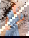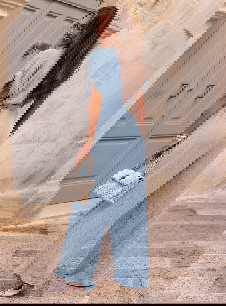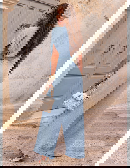 Błękitny kombinezon z długimi nogawkami Adelasia to połączenie luzu i kobiecego stylu. Zachwyca prostotą formy i subtelnym kolorem, który pasuje do wielu typów urody.