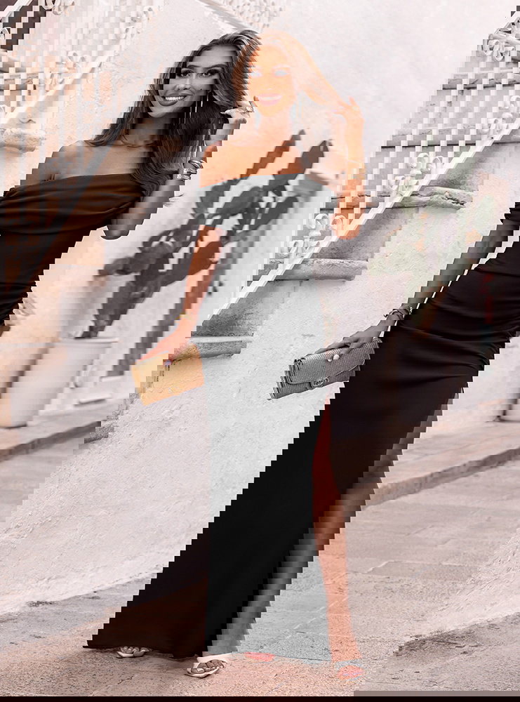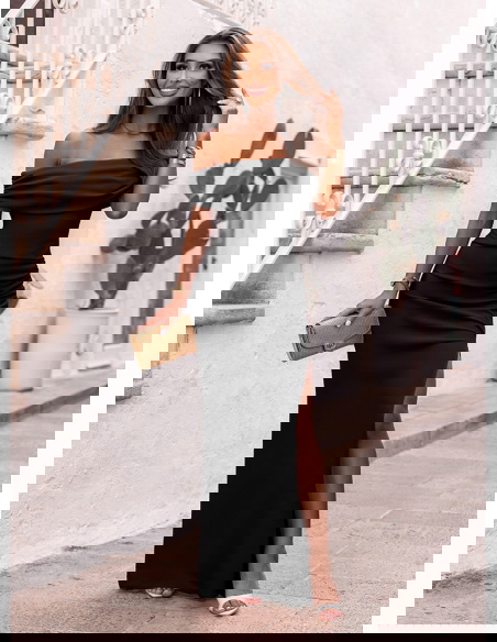 Czarna długa dopasowana sukienka z rozcięciem Ermione to doskonały wybór na eleganckie wyjścia – od przyjęć weselnych, przez bankiety, po wyjątkowe kolacje i wieczory galowe.