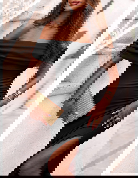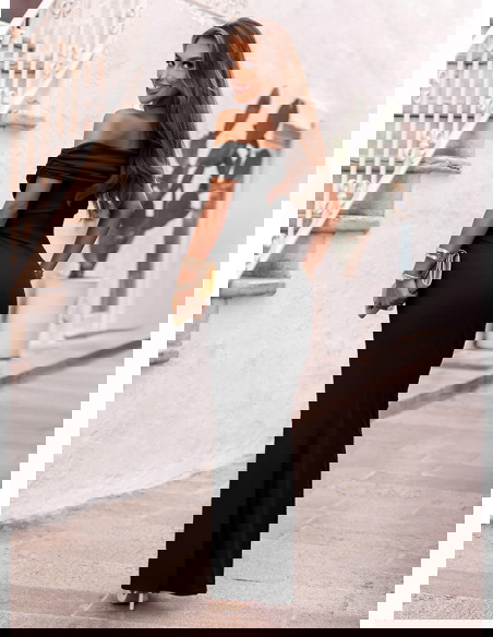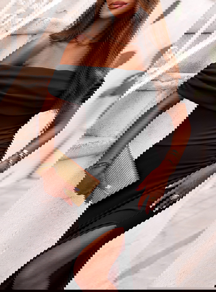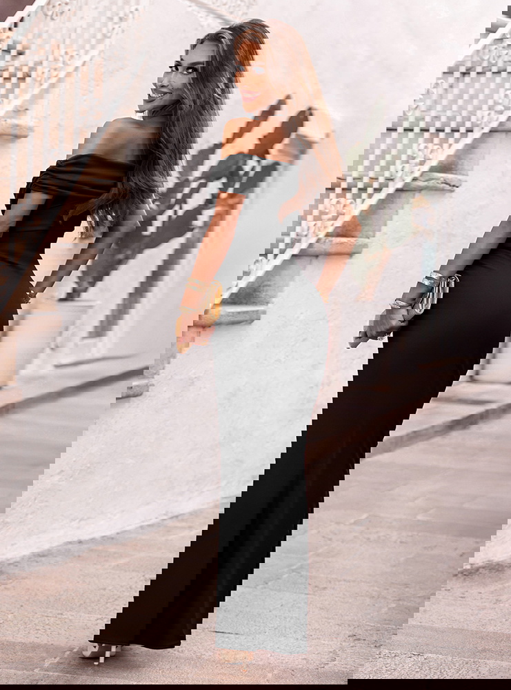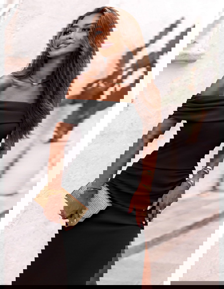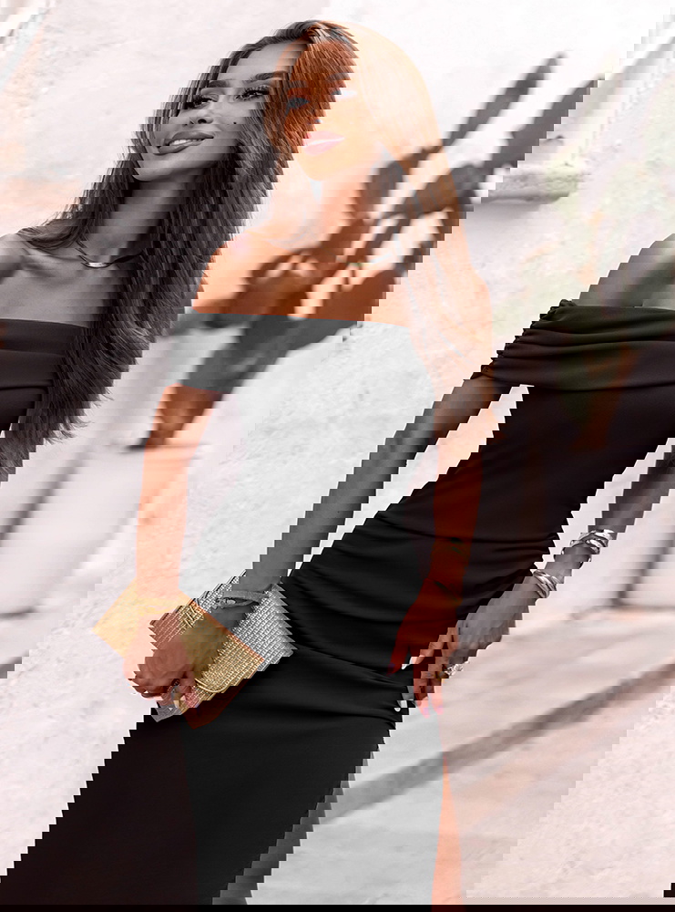 Czarna długa dopasowana sukienka z rozcięciem Ermione to klasyka w najbardziej zmysłowym wydaniu. To model, który łączy ponadczasową elegancję z nowoczesną formą, idealnie podkreślając kobiece kształty. Off-shoulder, czyli dekolt odsłaniający ramiona, dodaje wyrafinowania i subtelnej zmysłowości. Dopasowany krój pięknie przylega do ciała, modelując sylwetkę i eksponując jej atuty. Rozcięcie na nodze to efektowny detal, który dodaje całości lekkości i nuty kokieterii. To sukienka, która zdecydowanie przyciąga spojrzenia, ale robi to ze smakiem i klasą. Sprawdzi się wszędzie tam, gdzie chcesz wyglądać wyjątkowo – bez kompromisów. Czerń nigdy nie wychodzi z mody, a w takim fasonie nabiera jeszcze większej siły wyrazu. Dzięki swojej prostocie i dopracowanym detalom, ta sukienka nie potrzebuje wiele – wystarczą delikatne dodatki, by stworzyć spektakularny efekt. To model stworzony dla kobiet pewnych siebie, które lubią wyglądać kobieco i z klasą.