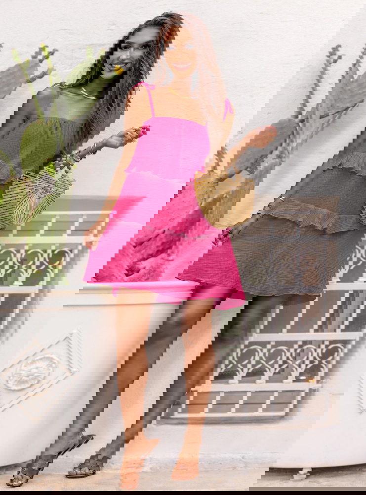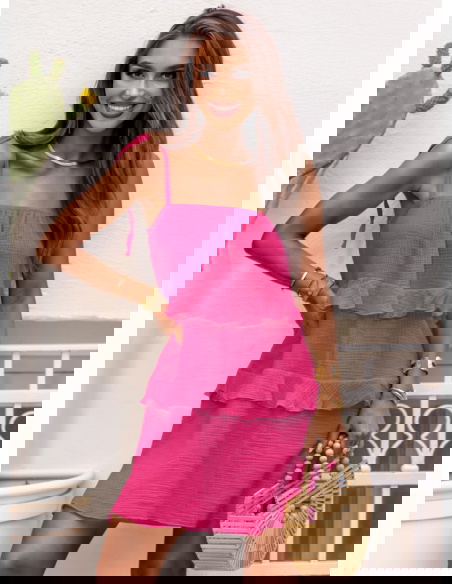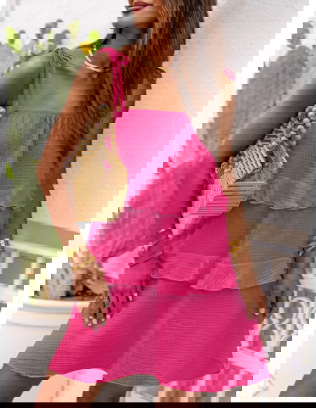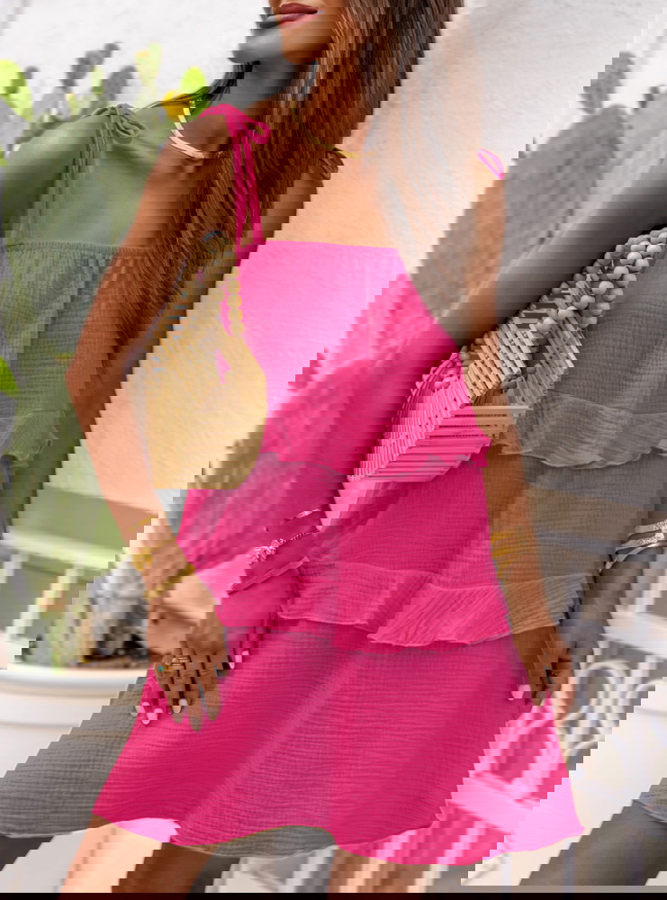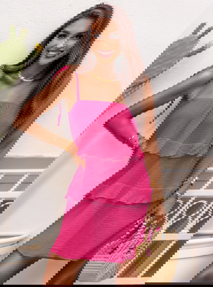 Muślinowa sukienka na ramiączkach z falbankami Rosariaa - fuksja