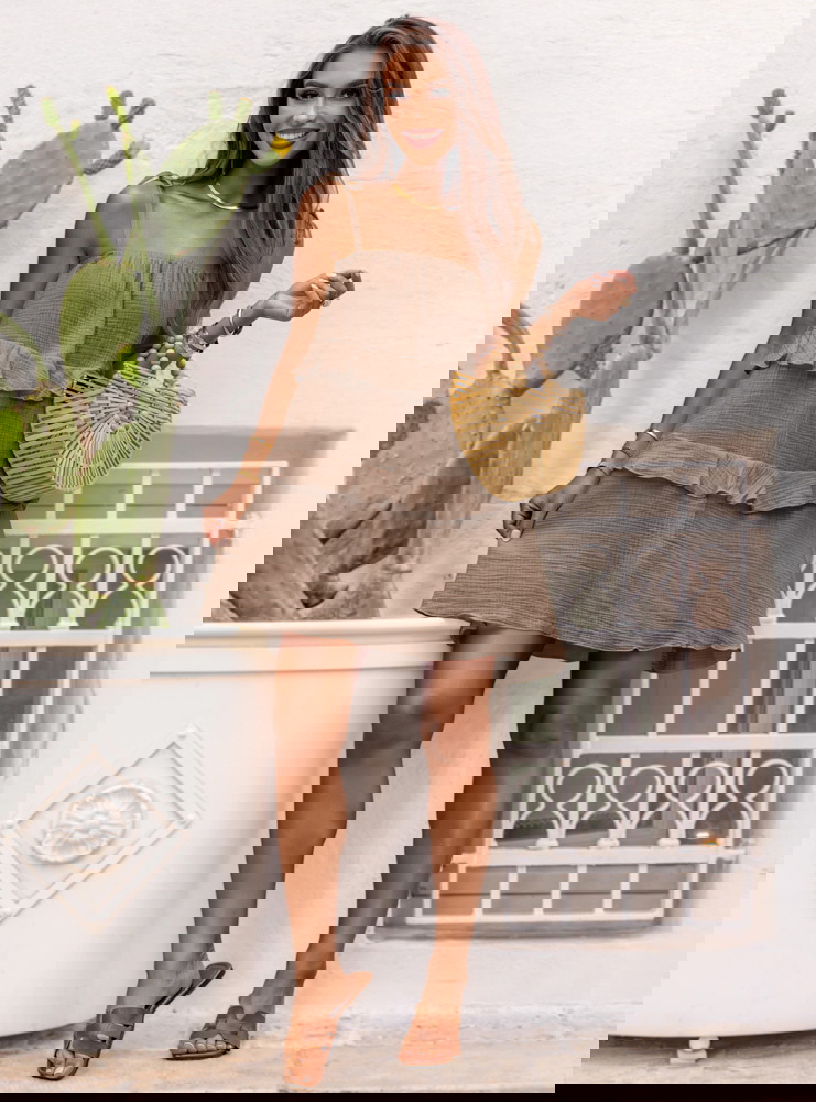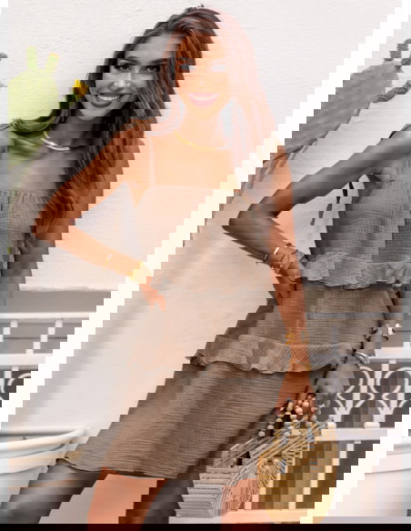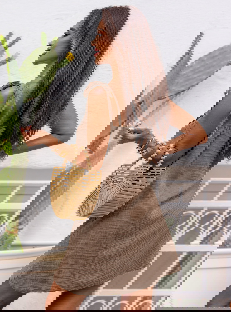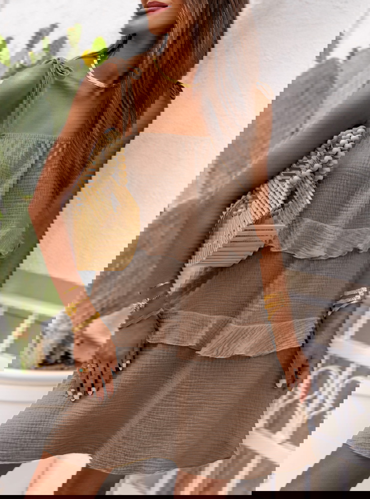 Muślinowa sukienka na ramiączkach z falbankami Rosariaa - mocha mousse to idealny wybór dla kobiet, które kochają lekkość, wygodę i subtelną elegancję. Ten model przyciąga uwagę swoją prostotą i dziewczęcym urokiem. Falbanki dodają jej finezji i delikatnego charakteru, co sprawia, że sukienka prezentuje się niezwykle uroczo i kobieco. Mocha mousse to kolor, który zachwyca swoją uniwersalnością – pasuje zarówno do jasnej, jak i ciemniejszej karnacji. Cienkie ramiączka nadają całości letniego, lekkiego klimatu, a wiązanie na ramionach to subtelny detal, który przyciąga wzrok. Sukienka pięknie układa się na sylwetce, zapewniając swobodę ruchów i komfort noszenia. To propozycja, która łączy casualową nonszalancję z modową świadomością. Świetnie sprawdzi się w roli codziennej stylizacji, ale też na specjalne okazje, kiedy chcemy wyglądać świeżo i stylowo. Jest to model, w którym po prostu chce się spędzać czas – w pełni kobiecy, ale bez zbędnego przerysowania. Jeśli szukasz sukienki, która będzie uniwersalna, a jednocześnie nietuzinkowa – to właśnie ta!
