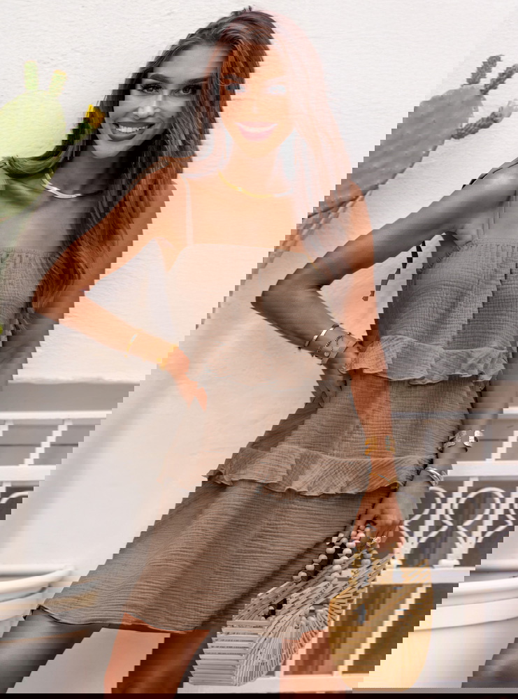 Muślinowa sukienka na ramiączkach z falbankami Rosariaa - mocha mousse świetnie sprawdzi się na letnie wyjścia na miasto lub kawę z przyjaciółką. Idealna na urlopowe spacery i zwiedzanie w ciepłe dni.