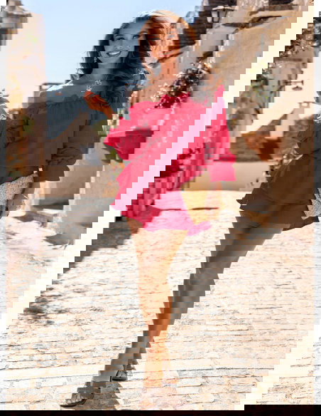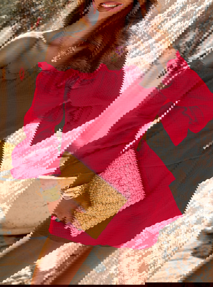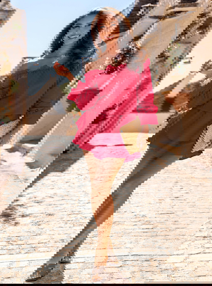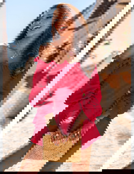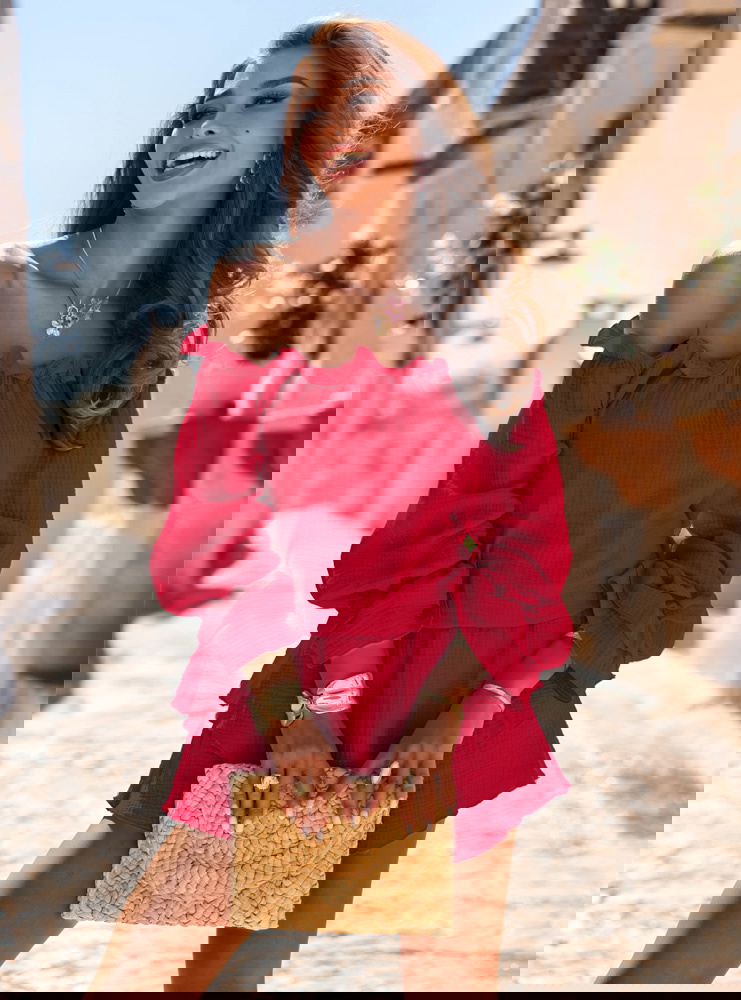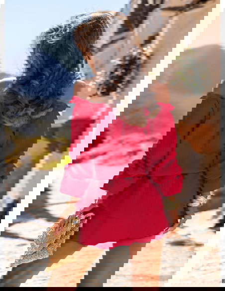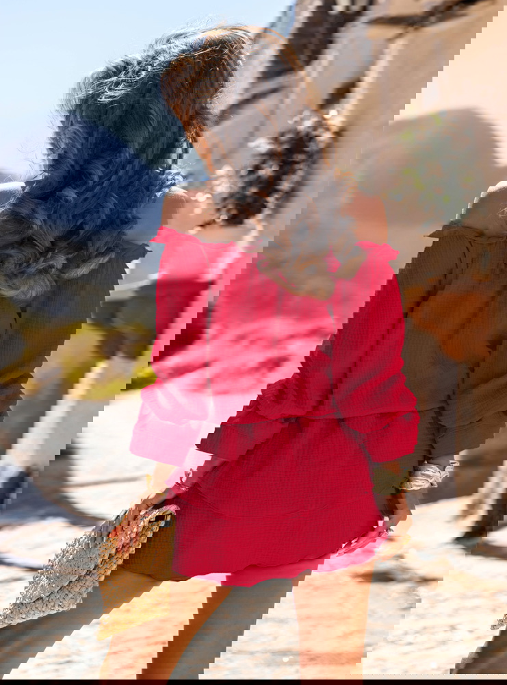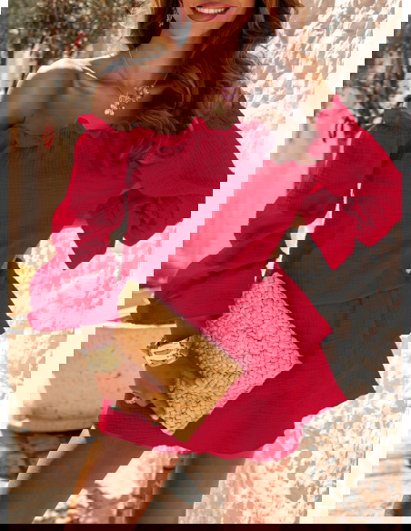 Malinowy muślinowy kombinezon jak sukienka z odkrytymi ramionami Marilenaa to esencja letniego uroku i kobiecej swobody. Z pozoru wygląda jak romantyczna sukienka, ale skrywa funkcjonalność wygodnego kombinezonu. Jego intensywny, malinowy kolor przyciąga spojrzenia i dodaje energii każdej stylizacji. Falbanki przy dekolcie i na dole tworzą lekki, zwiewny efekt, który idealnie współgra z wakacyjnym klimatem. Odkryte ramiona podkreślają subtelnie kobiecą linię szyi i ramion, dodając stylizacji wdzięku. Muślinowa faktura nadaje całości lekkości i naturalności, a jednocześnie wygląda świeżo i modnie. Luźny krój nie krępuje ruchów, dzięki czemu będziesz czuć się komfortowo przez cały dzień. To model, który sprawdzi się zarówno na wakacjach, jak i w mieście, gdy chcesz wyglądać dziewczęco, ale z klasą. Idealnie pasuje do koszyczkowej torebki, złotej biżuterii i wygodnych klapek. Ten kombinezon to must-have na słoneczne dni – bez przesady, ale z charakterem.