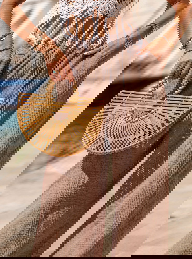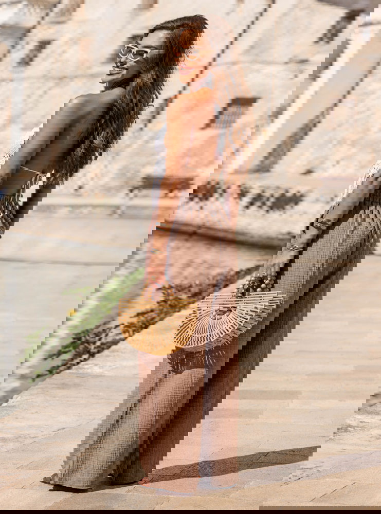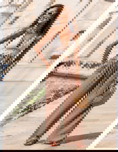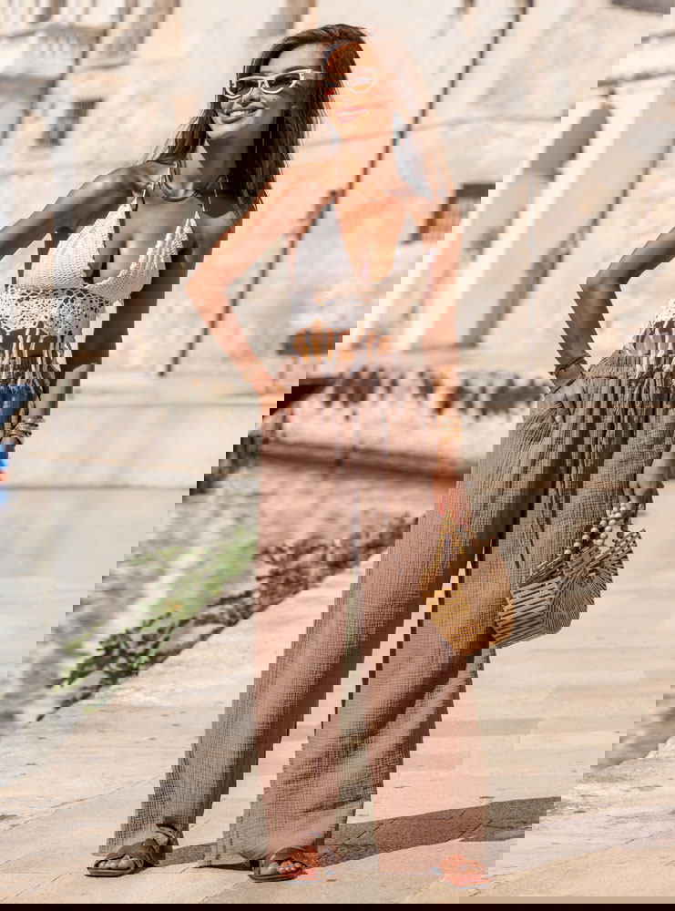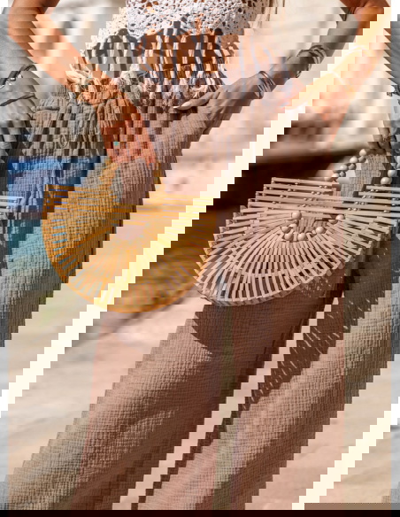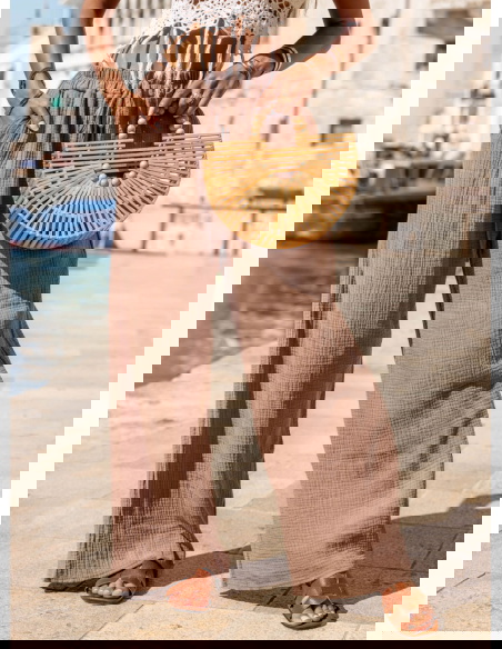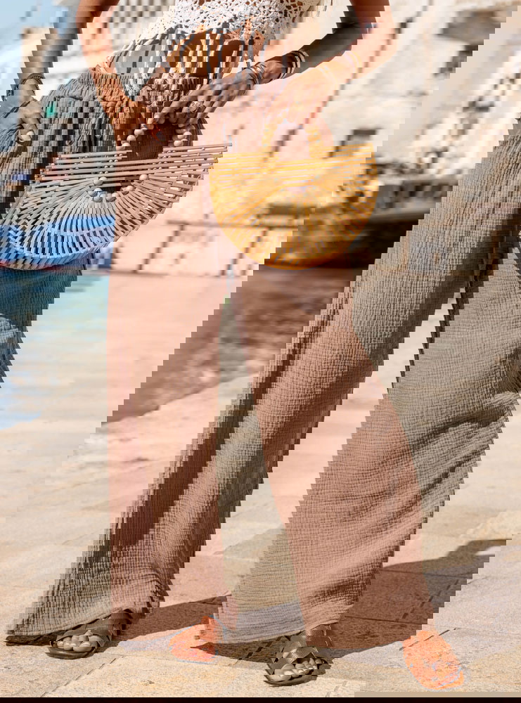 Muślinowe spodnie Iride - mocha mousse sprawdzą się idealnie podczas wakacyjnych spacerów brzegiem morza. To świetna propozycja na leniwe popołudnia spędzane w miejskich kawiarniach.