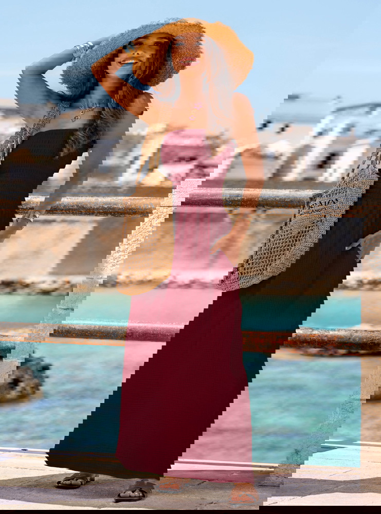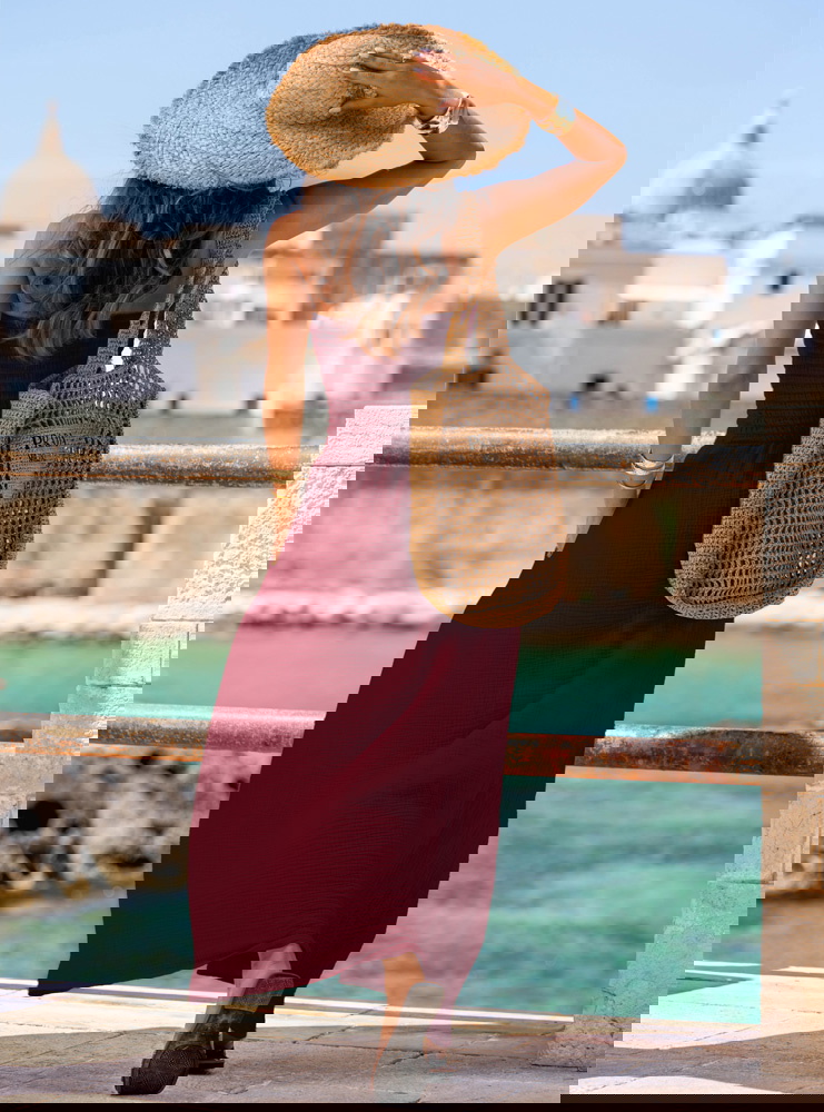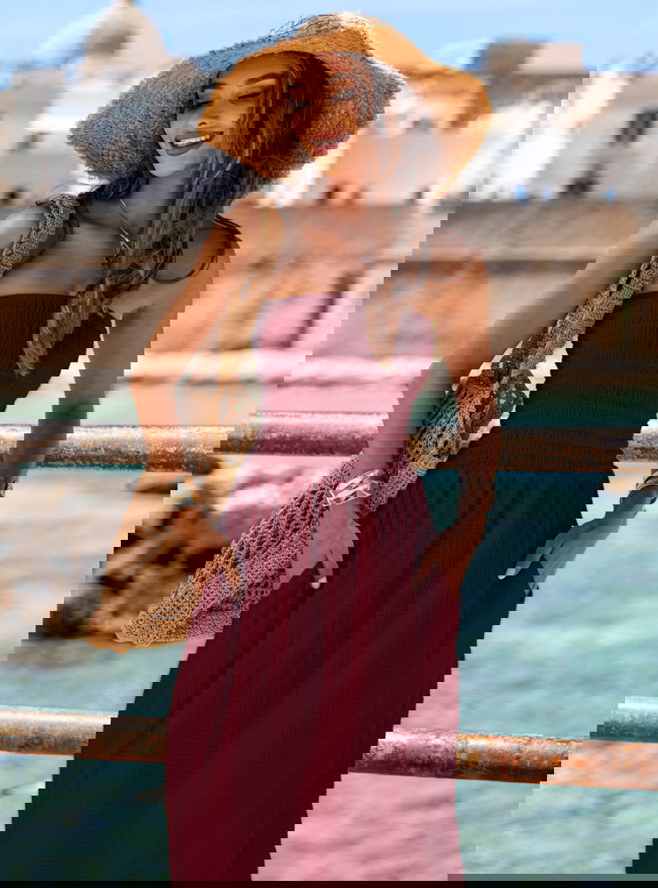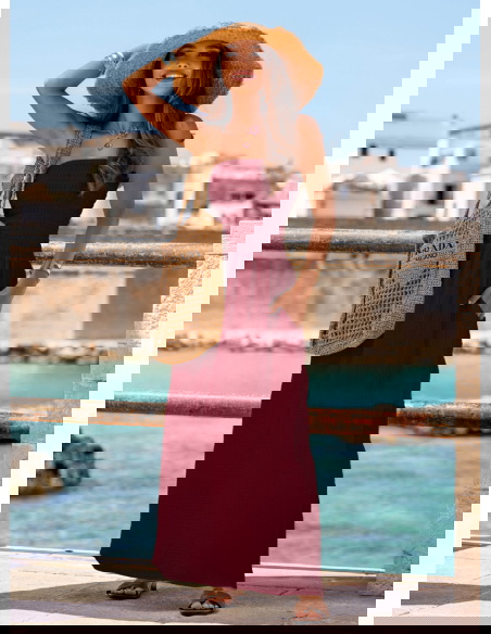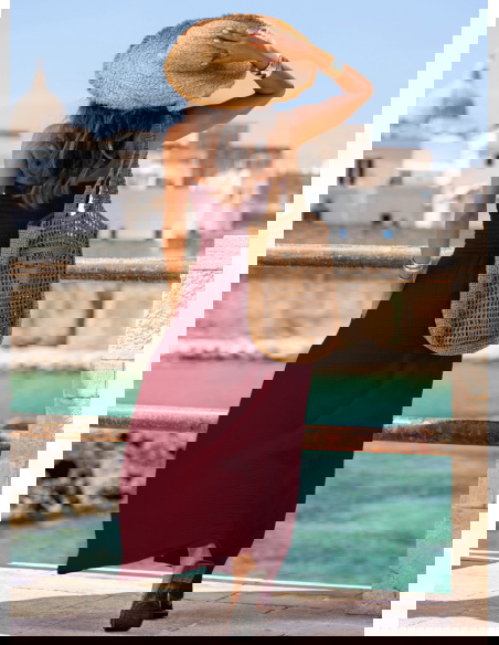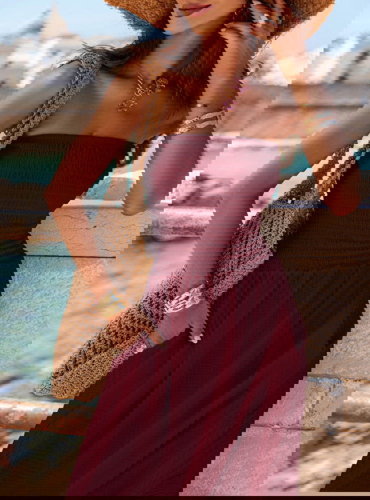 Bordowa muślinowa długa sukienka bez ramiączek Federicaa to kwintesencja letniego szyku z nutą zmysłowości. Głęboki odcień i minimalistyczny fason sprawiają, że każda stylizacja nabiera eleganckiego charakteru.