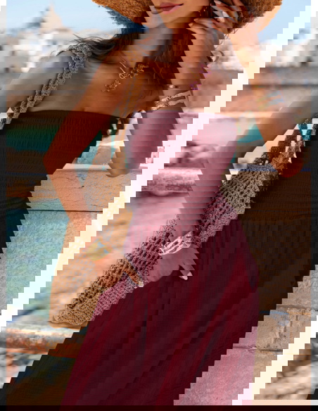 Bordowa muślinowa długa sukienka bez ramiączek Federicaa to symbol letniej swobody w eleganckim wydaniu. Jej głęboki, nasycony odcień bordowy przyciąga spojrzenia i podkreśla wyrazisty charakter stylizacji. Sukienka układa się miękko wzdłuż sylwetki, tworząc subtelną grę falban i drapowań. Brak ramiączek eksponuje ramiona i dekolt, wprowadzając lekko zmysłowy akcent. Elastyczna góra bezpiecznie utrzymuje kreację na miejscu, dając jednocześnie poczucie wygody. Długość maxi subtelnie otula nogi, nadając sylwetce lekkości i wdzięku. Krój bez zbędnych zdobień sprawia, że sukienka jest łatwa do zestawiania z dodatkami. Dzięki swojej uniwersalności sprawdzi się w wielu stylizacjach – od wieczornych, po te bardziej swobodne. Ten model łączy w sobie ponadczasowy szyk z odezwą najnowszych trendów. To idealna propozycja na lato, gdy chcesz poczuć się kobieco i wyjątkowo.