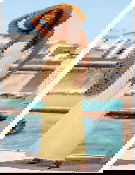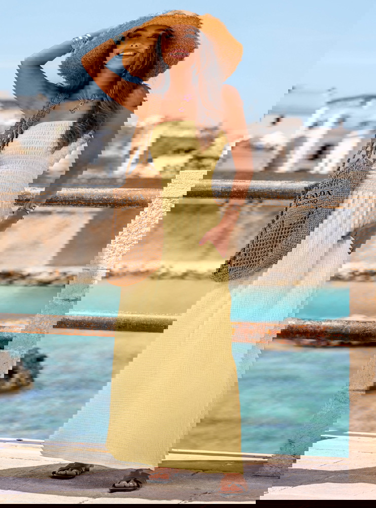 Muślinowa długa sukienka bez ramiączek Federicaa - masełkowa świetnie sprawdzi się podczas letnich spacerów w nadmorskiej scenerii, podkreślając wakacyjny nastrój. To doskonały wybór na romantyczne kolacje przy zachodzie słońca, kiedy chcesz poczuć się zmysłowo i kobieco.