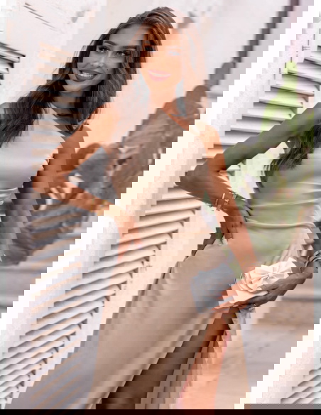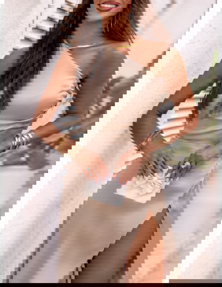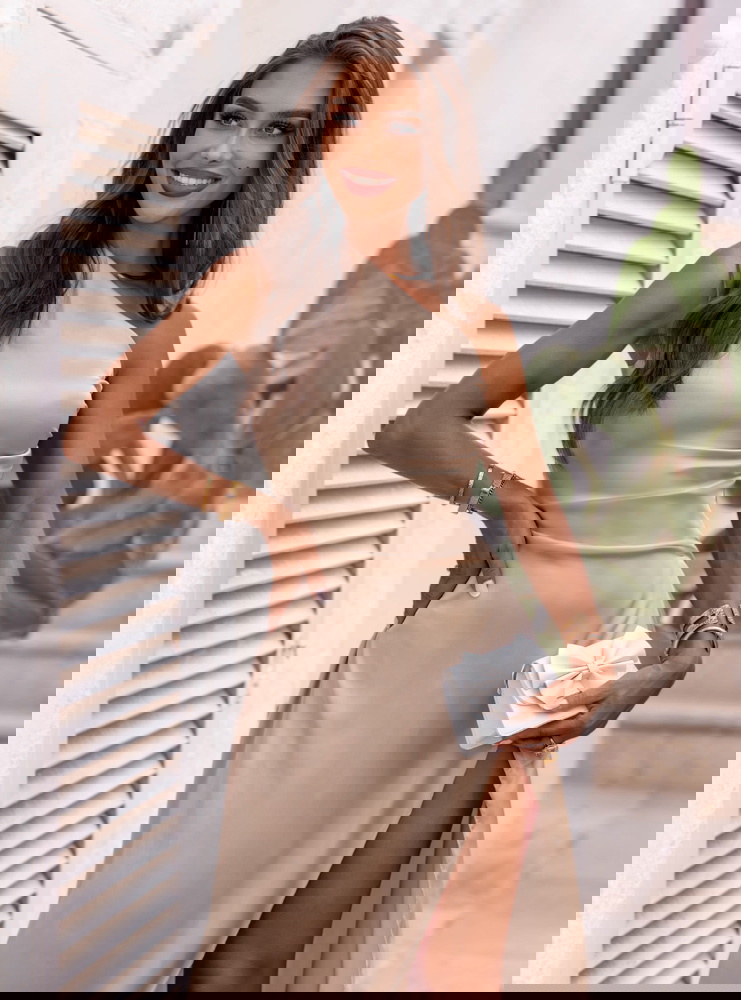 Beżowa satynowa długa sukienka na jedno ramię Rossella to propozycja, która zachwyca od pierwszego spojrzenia. Jej minimalistyczny, a zarazem wyrafinowany krój sprawia, że każda kobieta poczuje się w niej wyjątkowo. Fason na jedno ramię dodaje niebanalnego charakteru i subtelnej zmysłowości. Pięknie układa się na sylwetce, podkreślając kobiece kształty bez zbędnego przerysowania. Satynowy połysk dodaje całości elegancji i klasy, ale w nowoczesnym wydaniu. Długie, efektowne rozcięcie z przodu przyciąga wzrok i eksponuje nogi w niezwykle kobiecy sposób. Ta sukienka to esencja ponadczasowego stylu z nutką odwagi. Jest jednocześnie elegancka, delikatna i wyrazista – dokładnie taka, jak lubimy. Świetnie prezentuje się zarówno w ruchu, jak i na zdjęciach, co czyni ją idealnym wyborem na ważne chwile. Jeśli szukasz czegoś wyjątkowego, ta sukienka z pewnością spełni Twoje oczekiwania.