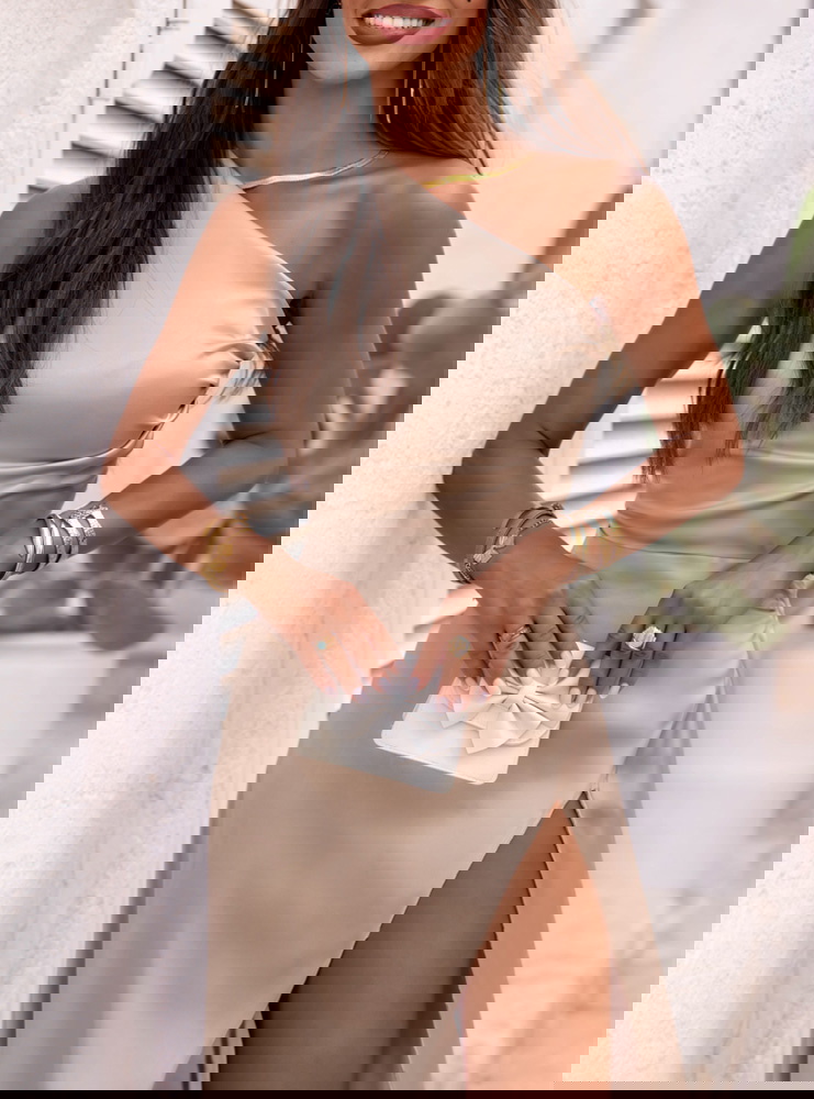 Beżowa satynowa długa sukienka na jedno ramię Rossella to wybór, który zawsze się sprawdzi. Jej kobiecy krój i zmysłowe detale wyróżniają ją spośród innych modeli.